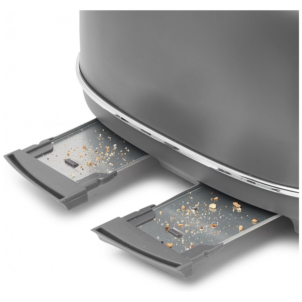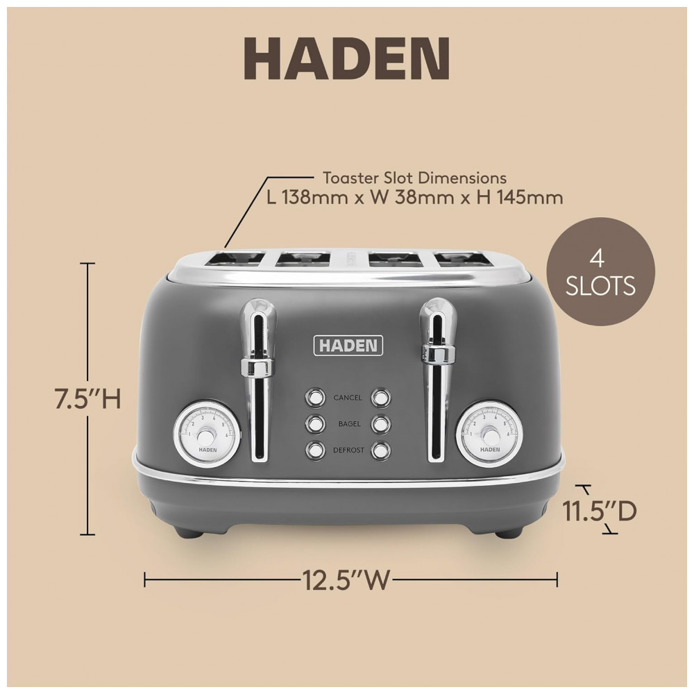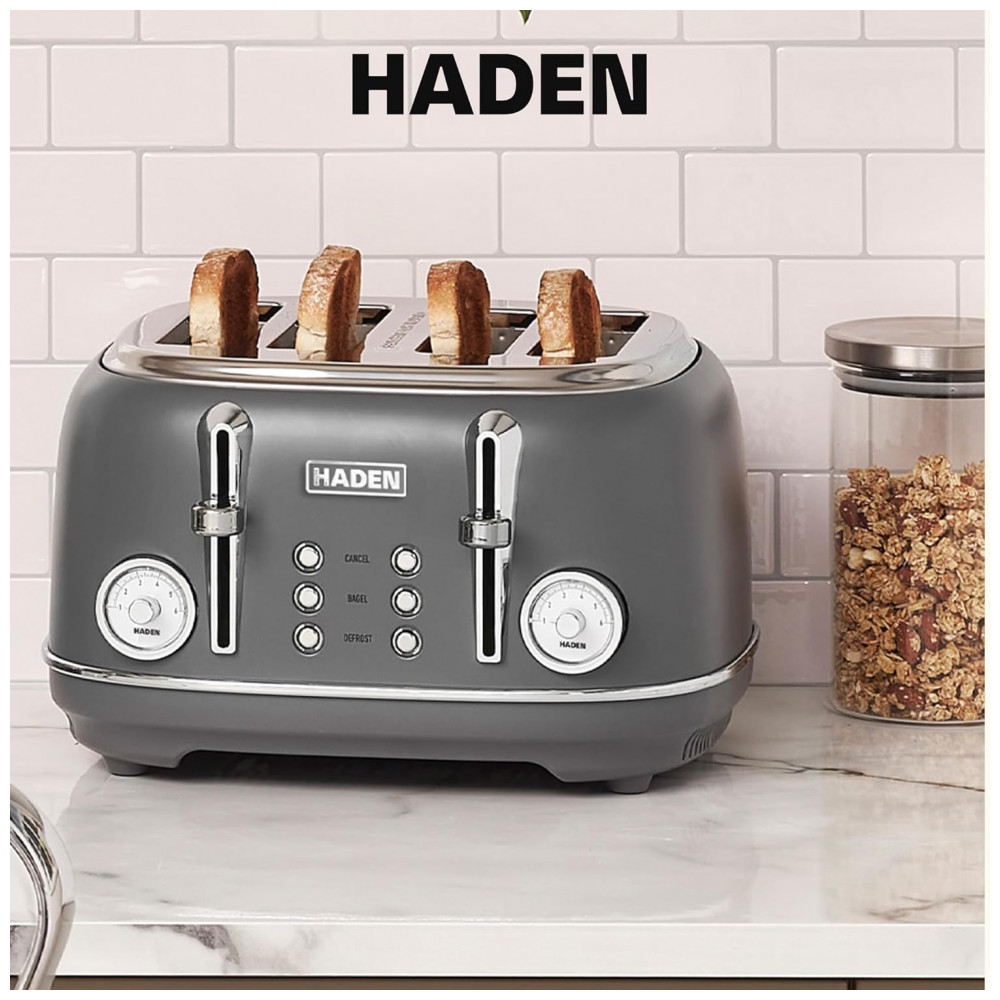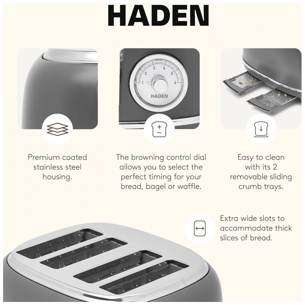 A torradeira HADEN Chelsea 4 fatias é produzida em aço inoxidável com acabamento esmaltado cinza fosco e detalhes cromados, indicada para cozinhas residenciais que precisam de maior capacidade de preparo simultâneo de torradas. As quatro fendas largas com centragem automática permitem torrar pães, bagels, waffles e fatias mais espessas de forma uniforme.