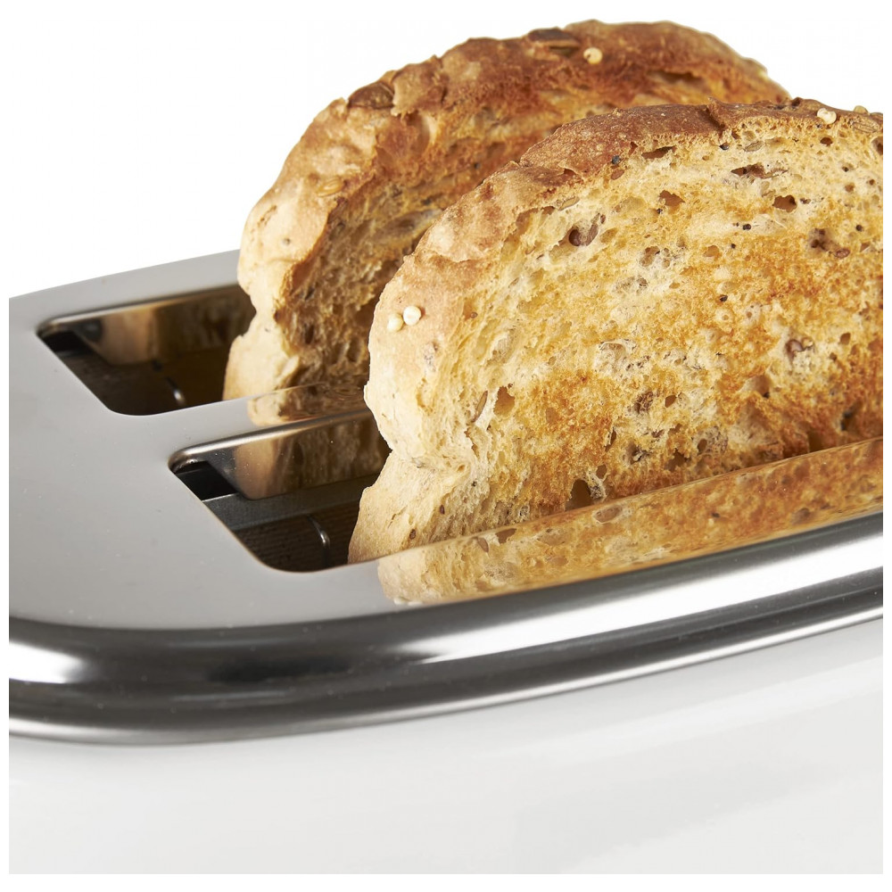 A torradeira HADEN Dorset 2 fatias marfim é produzida em aço inoxidável com acabamento brilhante e detalhes cromados, trazendo desenho compacto para uso em bancadas de cozinha residencial. As fendas extra largas com grade autocentralizadora acomodam diferentes tipos de pães, incluindo bagels e fatias artesanais, permitindo tostagem uniforme.