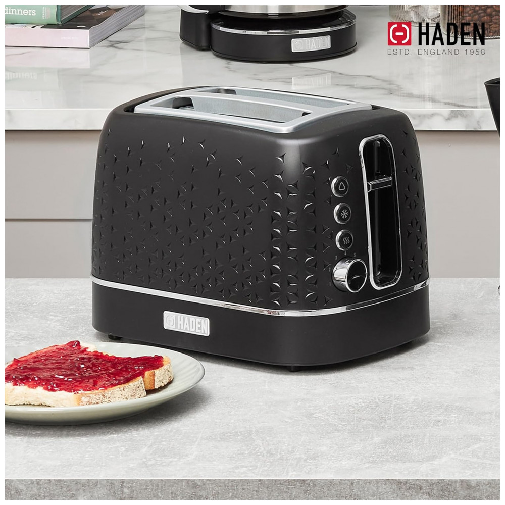 A torradeira HADEN Starbeck 2 fatias é produzida com corpo em material plástico de engenharia com detalhes cromados, trazendo frente texturizada em desenho geométrico para uso em bancadas de cozinha residencial. As duas fendas largas com função de centragem automática permitem torrar pães, bagels, waffles e fatias mais espessas de maneira uniforme.
