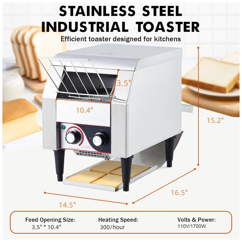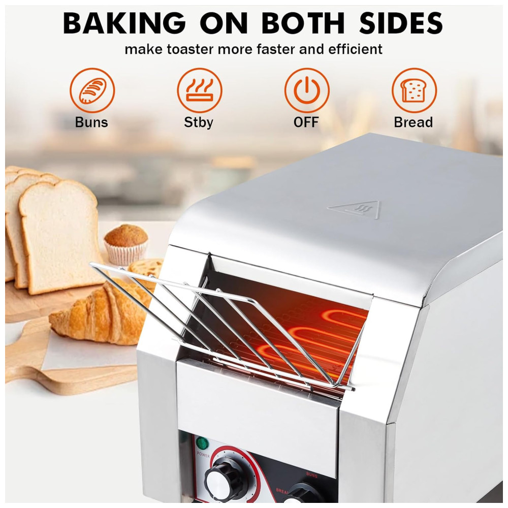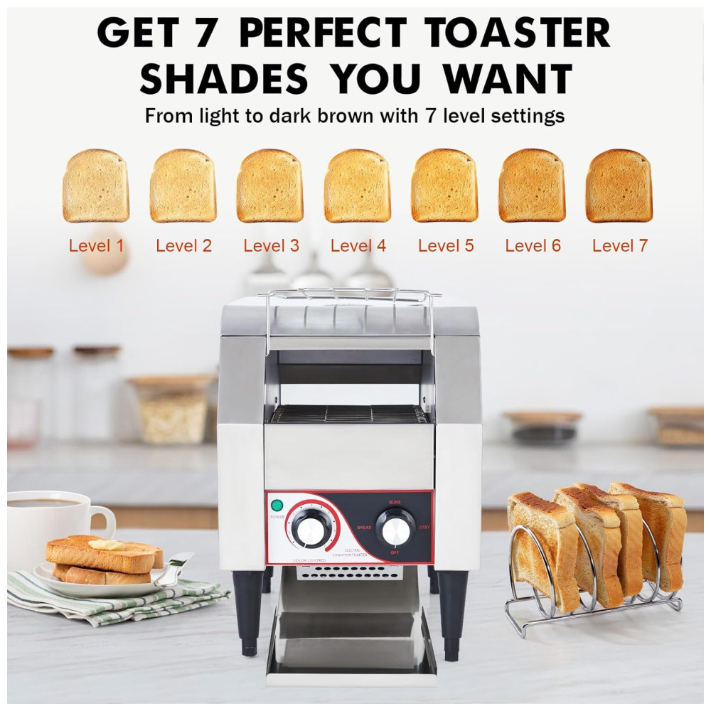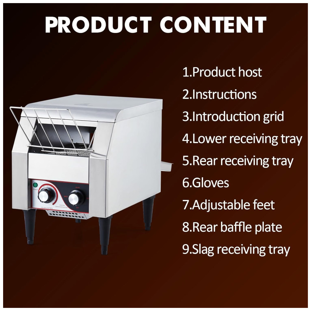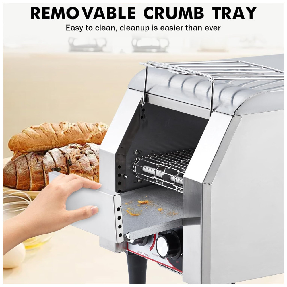 A Torradeira Comercial da Garvee, com corrente de aço inoxidável inclusa, garante a entrega perfeita do pão, aumentando significativamente a eficiência da torragem. Ideal para locais com alta demanda de pão, como cafeterias, padarias ou cafés, permite que a equipe gerencie facilmente o movimentado café da manhã. Conte com nosso ajudante confiável para agilizar as operações durante as manhãs corridas e garantir um atendimento rápido aos seus clientes. Com 7 ajustes precisos de velocidade, 17 configurações de calor possibilitam um controle preciso do processo de assamento. Os diferentes níveis de calor criam pães de diversas cores e níveis de crocância para atender as preferências de todos. Com três padrões de cozimento, é possível controlar os elementos de aquecimento superior e inferior separadamente, atendendo a diversas necessidades de cozimento. Capaz de dispensar pão pela frente ou traseira, o design compacto da torradeira se encaixa perfeitamente em uma bancada de cozinha. Quatro pés antiderrapantes mantêm a torradeira estável. Fácil de operar, feita de aço inoxidável resistente, garantindo durabilidade e resistência à corrosão. Com baixo ruído e fácil de limpar, é equipada com entradas de ar para dissipação de calor eficaz, além de uma bandeja de migalhas removível. Ideal para uma grande variedade de pães, nossa torradeira lida com tudo de forma rápida e precisa. Perfeita para uso comercial em restaurantes, padarias, escritórios, hotéis, escolas, cafeterias e grandes famílias.