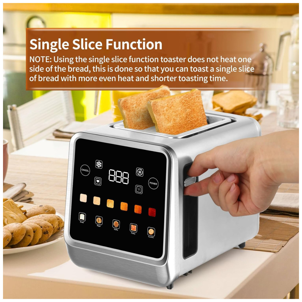 Além das funções básicas de Cancelar, Descongelar e Reaquecer, esta torradeira digital oferece funções especiais para diferentes tipos de pães, incluindo Bagel, Pão Branco, Waffle, Muffin Inglês, Sem Glúten e Grãos. Com elementos de aquecimento de alta eficiência de 900 W, ela é 50 vezes mais rápida do que os modelos padrão, garantindo uma distribuição uniforme do calor para uma tostagem consistente.