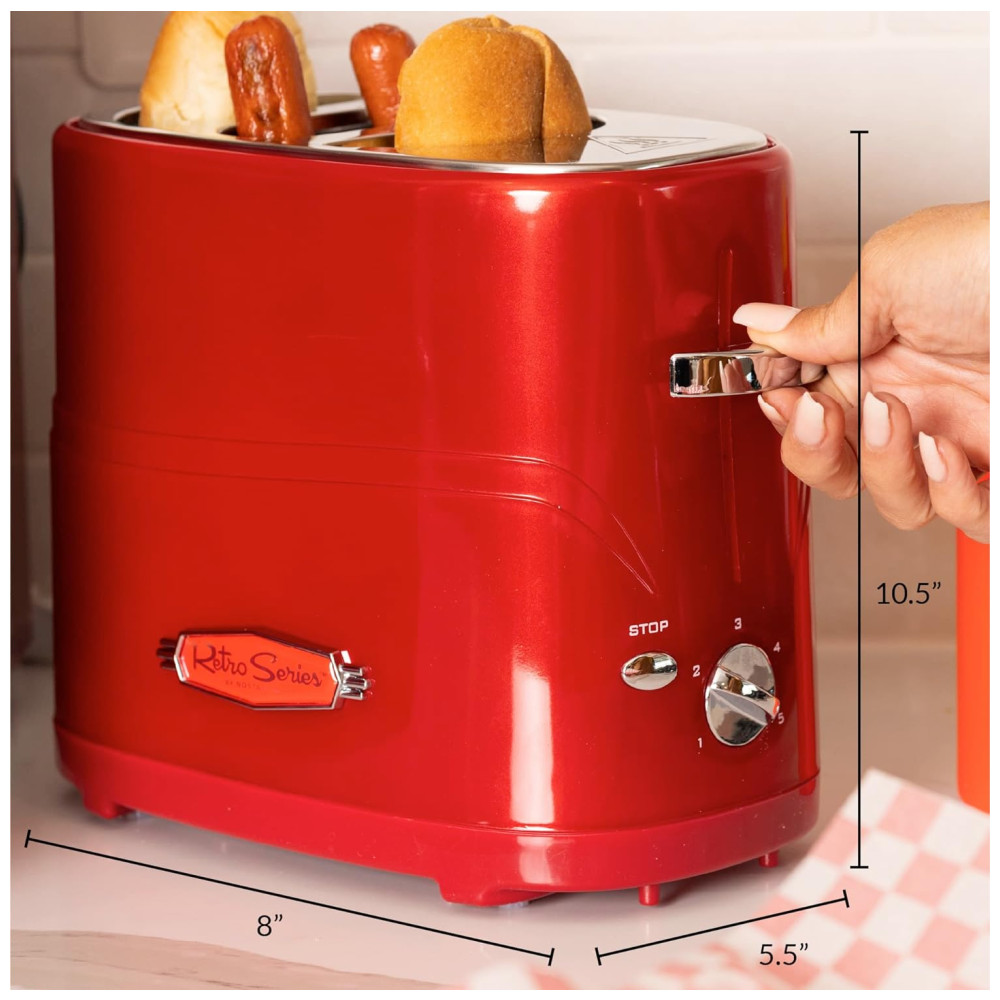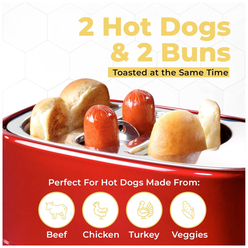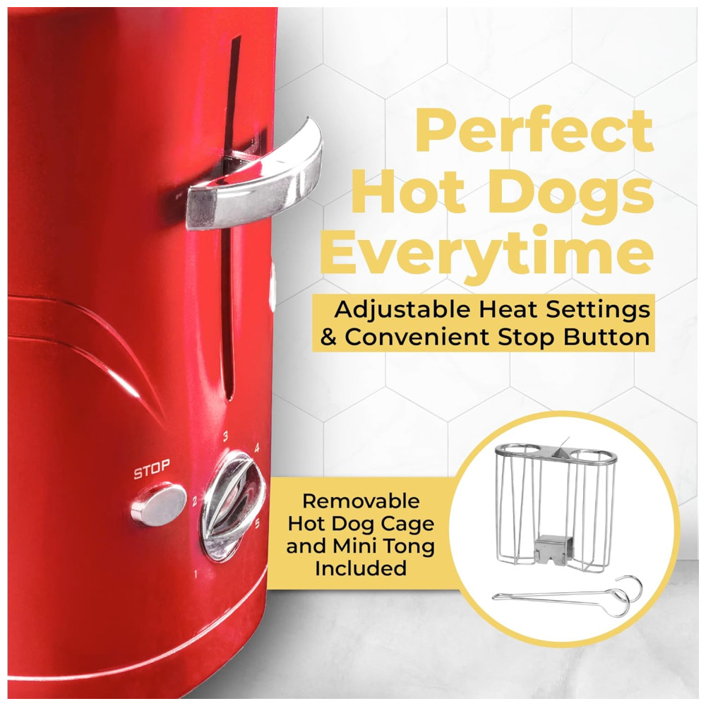 ÓTIMA DEGUSTAÇÃO: Este fogão de cachorro quente torra até 2 de seus cachorros quentes de tamanho normal ou extra recheados favoritos, juntamente com dois pães de cachorro quente ao mesmo tempo.