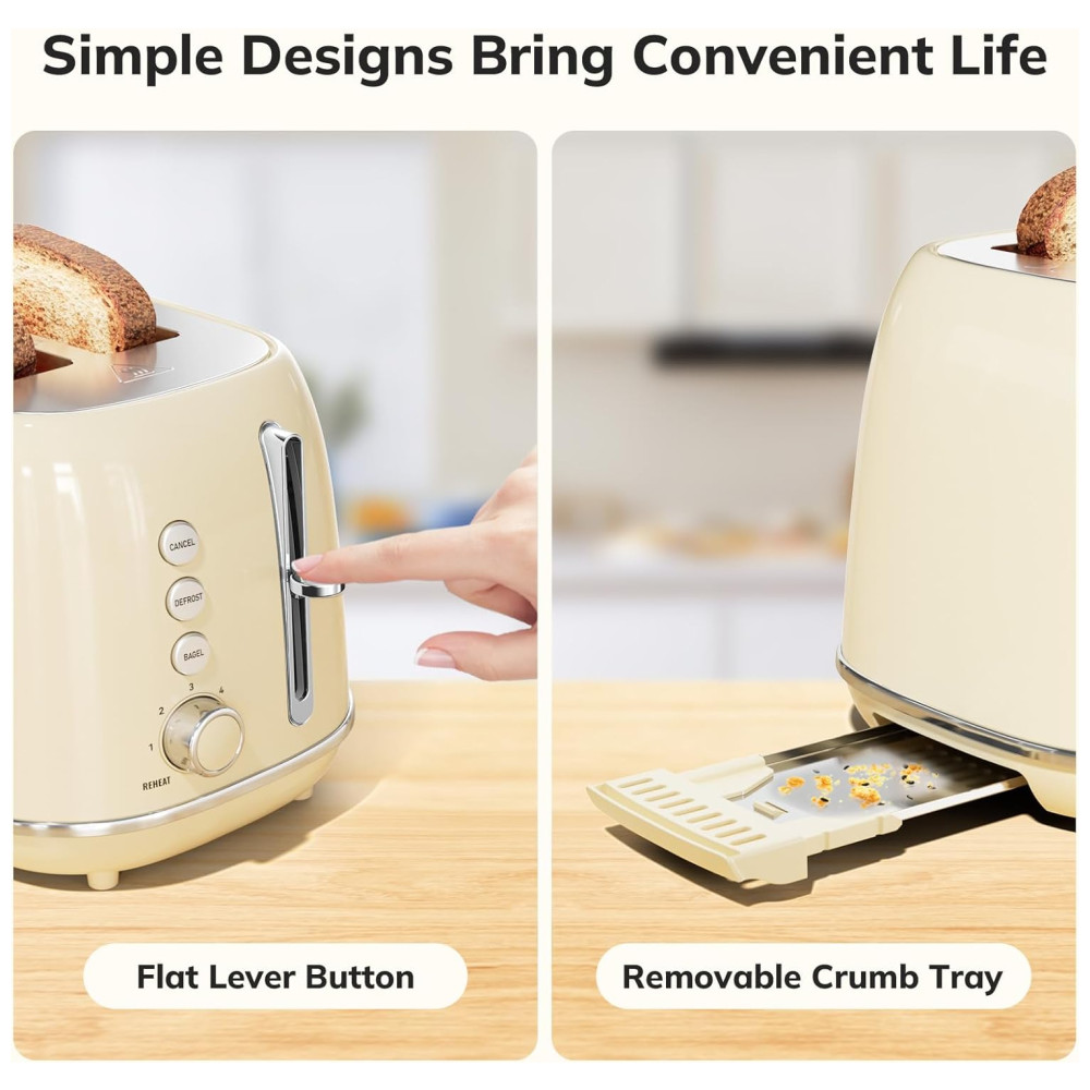 A torradeira Keenstone WT-330 apresenta design retrô em inox bege, preparada para até 2 fatias simultâneas. Possui funções exclusivas para bagel, descongelar e cancelamento, além de 6 ajustes de tostagem para diferentes preferências. Os slots extra largos de 3,8 cm acomodam pães variados, inclusive fatias espessas e bagels. A estrutura metálica é livre de BPA e oferece segurança ao toque. Remoção facilitada de migalhas com bandeja destacável, além de sistema antiderrapante e organização para cabo elétrico. Funcionamento intuitivo por alavanca manual e seletor frontal giratório.
