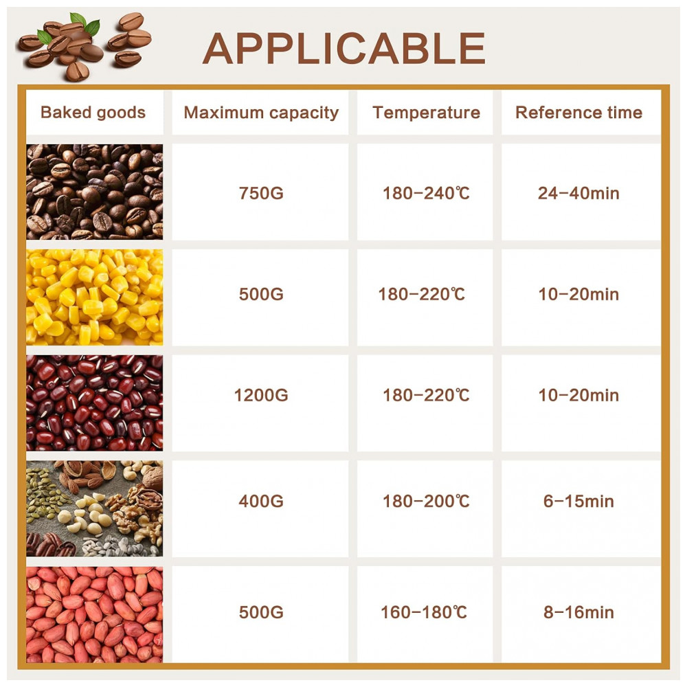 Multiuso: Este torrador de grãos de café pode ser não apenas para torrar diferentes quantidades de grãos de café, mas também para assar pipoca, amendoim, soja, sementes de girassol, frutas secas e outros grãos.