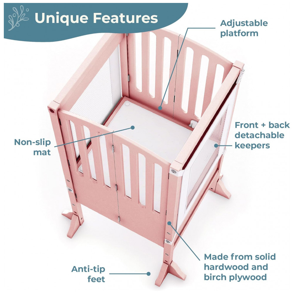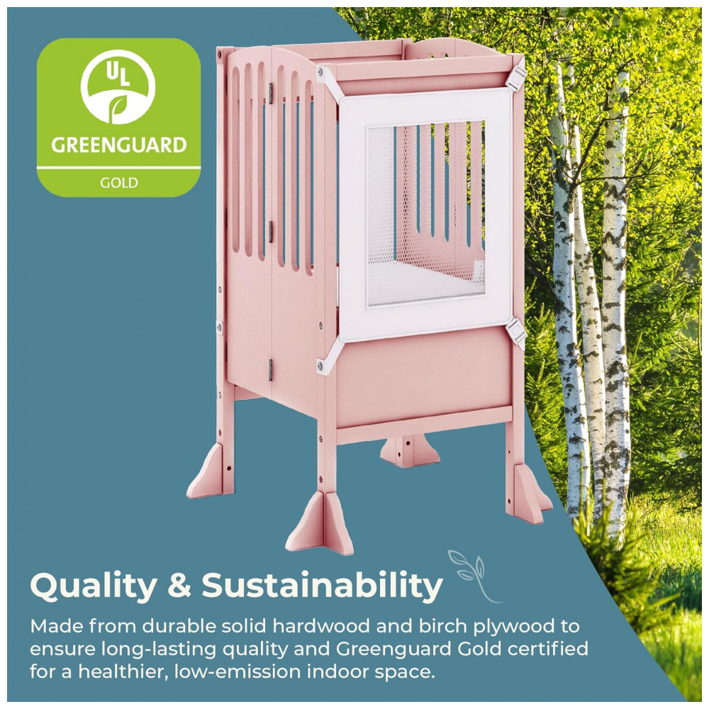 O modelo utiliza madeira maciça e compensado de bétula com acabamento atóxico em rosa e é certificado GREENGUARD Gold para baixas emissões, adequado a ambientes internos. Acompanha tapete antiderrapante para a plataforma e barreiras Kitchen Helper Keeper em rede, que fecham os lados abertos para aumentar a segurança durante o uso.