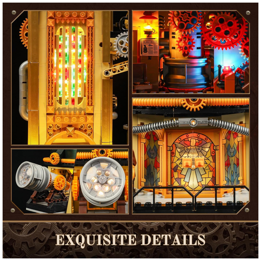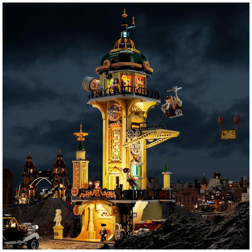 O sistema de iluminação utiliza dezenove pontos de LED distribuídos em lustre de entrada, área de reator com efeito de chamas vermelhas, sinais em azul e vermelho, iluminação do telescópio e baliza superior com efeito de luz pulsante azul. O conjunto acompanha seis minifiguras temáticas que representam personagens da torre e da cidade steampunk, ampliando as possibilidades de narrativa.