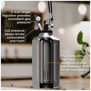 GRANDES DERRAMAMENTOS A QUALQUER MOMENTO, EM QUALQUER LUGAR a torneira cromada de aço inoxidável desta garrafa de água de parede dupla facilita para você servir suas bebidas onde quer que esteja, enquanto seu regulador de CO2 de estágio duplo fornece pressão suave e consistente para goles refrescantes até a última gota . Tanto a torneira quanto o regulador podem ser removidos para facilitar o transporte e reconectados assim que você chegar ao seu destino.