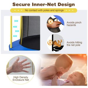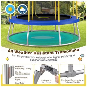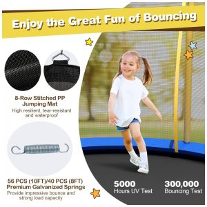 Presente certificado pela ASTM para seus filhos Apresentando um design exclusivo em forma de flor e cores brilhantes, este trampolim recreativo pode transformar seu quintal ou jardim em um parque de diversões atraente. Além do mais, este trampolim certificado pela ASTM pode não apenas trazer diversão sem fim, mas também promover o crescimento ósseo e aumentar a interação entre pais e filhos. Experiência de salto para crianças 74 redes altas e postes de rede curvados com mangas de espuma EPE macia fornecem proteção de segurança de 360 graus e evitam que as crianças sofram batidas inesperadas. Além disso, o design da rede interna e uma almofada de segurança de 3 camadas de espessura evitam riscos de esmagamento, bem como nenhum contato com postes e molas. A ampla entrada em forma de L com zíper duplo foi projetada para segurança adicional. Excelente desempenho de recuperação Equipado com um tapete de salto PP costurado de 8 fileiras de alta resiliência e resistente a rasgos e 56pcs 10 pés 40pcs 8 pés de molas galvanizadas fortes, este trampolim que passou em 300.000 testes de salto pode dar às crianças a melhor experiência de salto. Além disso, o tapete de salto passou no teste UV de 5.000 horas o que o torna adequado para uso ao ar livre. Estrutura de aço galvanizado por imersão a quente para serviços pesados A base circular aumenta a área de contato com o solo para maior estabilidade e suporte de até 425 LBS. Além disso, a estrutura deste trampolim para todas as condições climáticas é feita de tubos de aço galvanizado por imersão a quente, que oferecem maior estabilidade e resistência superior à ferrugem para uso duradouro. Fácil instalação A montagem é fácil com instruções passo a passo e ferramentas de instalação incluídas. Além disso, com instruções detalhadas e um sistema de travamento automático descomplicado, este trampolim é fácil de montar