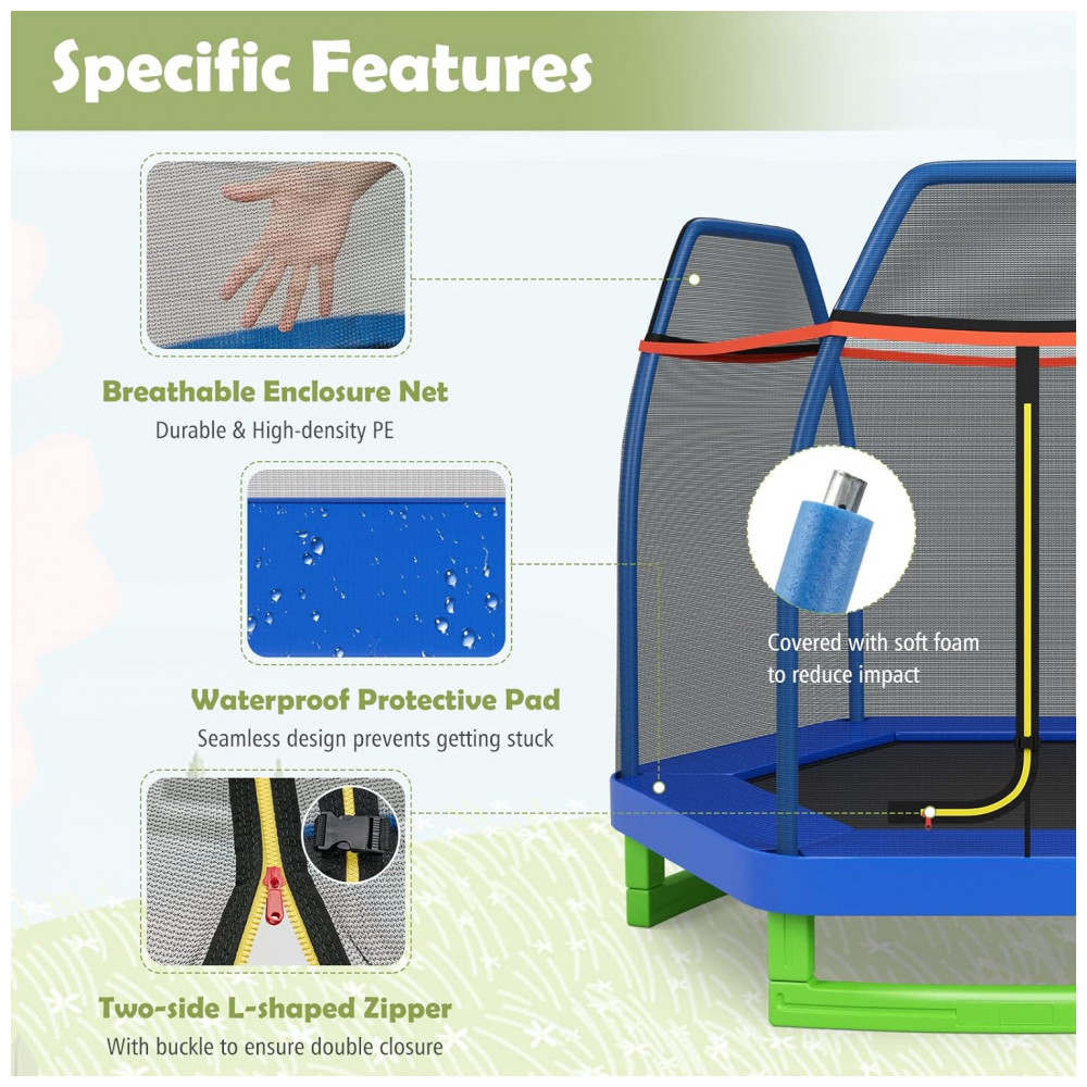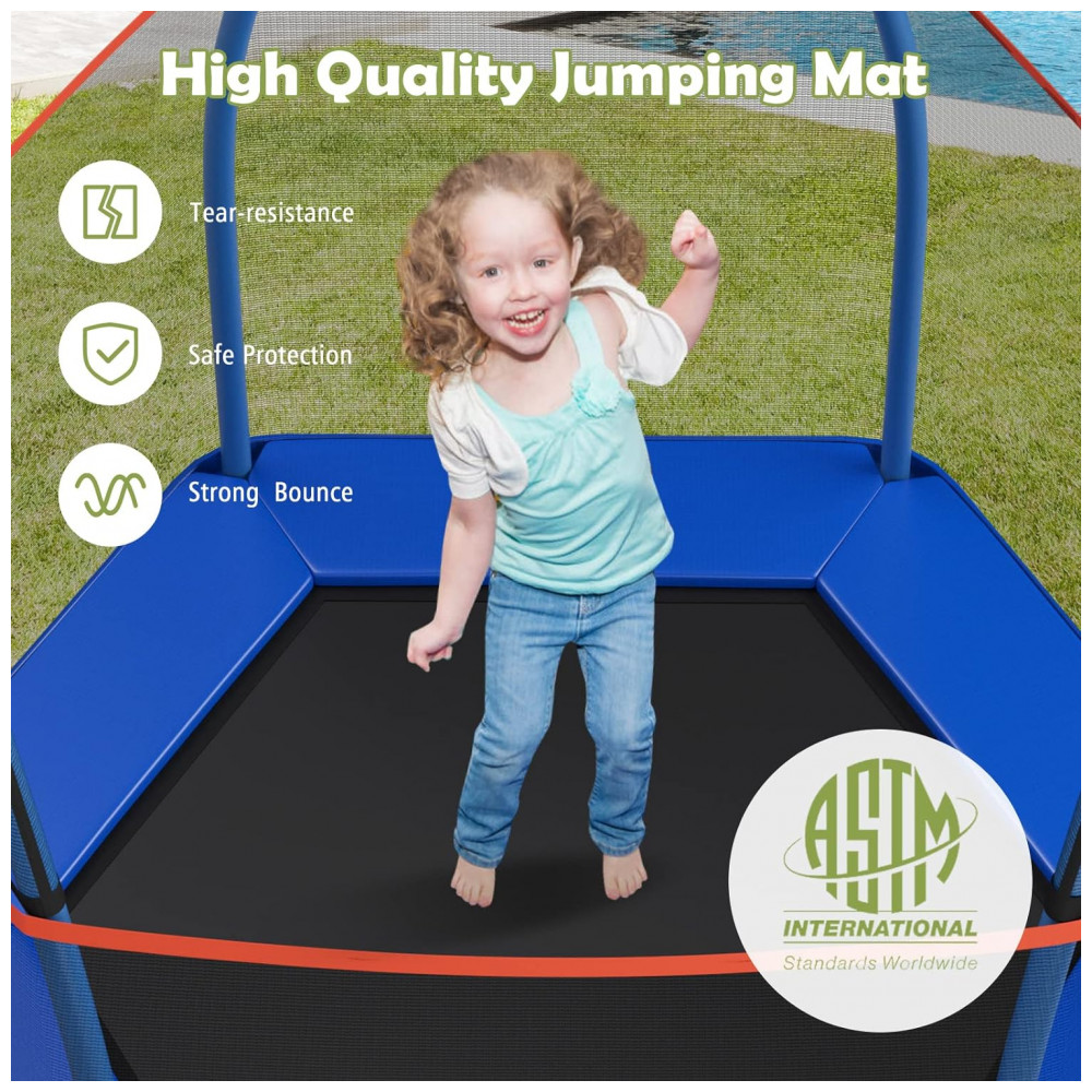 Descrição Este trampolim redondo de segurança ajudará os seus filhos a melhorar as suas capacidades de salto, ao mesmo tempo que promove o seu metabolismo corporal e melhora a sua imunidade. É caracterizado por uma forte estrutura de aço galvanizado e base triangular para aumentar a estabilidade, e a cerca de segurança está firmemente conectada à plataforma de salto para eliminar lacunas perigosas e proteger os pés do bebê contra lesões. A capa protetora de espuma EPE evita que seu filho colida acidentalmente ao pular livremente. Nosso trampolim é o presente perfeito para as crianças. Características Há uma rede protetora externa para proteger seu filho ao pular Rede protetora externa com zíper em forma de L, centro de atividades em grande escala Força de mola forte, grande força de tração, sem deformação A rede de segurança fortalece o amortecedor e tem forte resistência ao impacto Almofada de plataforma PP, desgaste capa protetora de espuma EPE resistente e de boa resiliência para evitar choques acidentais Pano Oxford acolchoado não belisca os pés do bebê Promove aumento de altura, melhora o efeito físico Especificações Material Aço galvanizado, PP, EPE Dimensão total 7,3 pés x 7,3 pés x 6,1 pés C x L x A Peso líquido 55 libras Capacidade de peso 220 libras O pacote inclui 1 x trampolim 1 x manual do usuário Rede de gabinete respirável Zíper em forma de L O trampolim infantil está equipado com uma rede de gabinete respirável. Ele não apenas mantém seu filho , mas também ajuda você a ficar de olho nos movimentos do seu filho. O zíper em forma de L tem um velcro que é mais do que o zíper comum e pode garantir um melhor fechamento quando eles brincam. Trampolim de segurança para crianças O design perfeito entre a cerca e a almofada, para que seu filho não fique preso no vão. O protetor de espuma EPE evita que seu filho bata acidentalmente ao pular livremente. E o grande tapete de plataforma circular de 83 polegadas de diâmetro oferece espaço suficiente para as crianças. Estrutura galvanizada resistente Este trampolim infantil de 7 pés é composto por uma estrutura de aço galvanizado e uma base triangular reforçada. Ele pode suportar um peso de 220 libras e evitar efetivamente que escorregue ao pular da plataforma. Longa vida útil Anexado com mola espessa anti ferrugem, alta elasticidade, sem deformação, para garantir o uso a longo prazo. A almofada da plataforma de salto é confeccionada em material PP, com elasticidade de alta qualidade, permitindo que as crianças pulem mais alto e mais felizes. Presente perfeito para crianças. Dimensão geral 7,3 pés x 7,3 pés x 6,1 pés C x L x A. Este trampolim recreativo será um destaque atraente para o seu quintal e servirá como um centro de atividades ao ar livre para o seu tempo semanal de diversão em família, garantindo que seus filhos e amigos caiam na gargalhada todos os dias. O presente perfeito para crianças