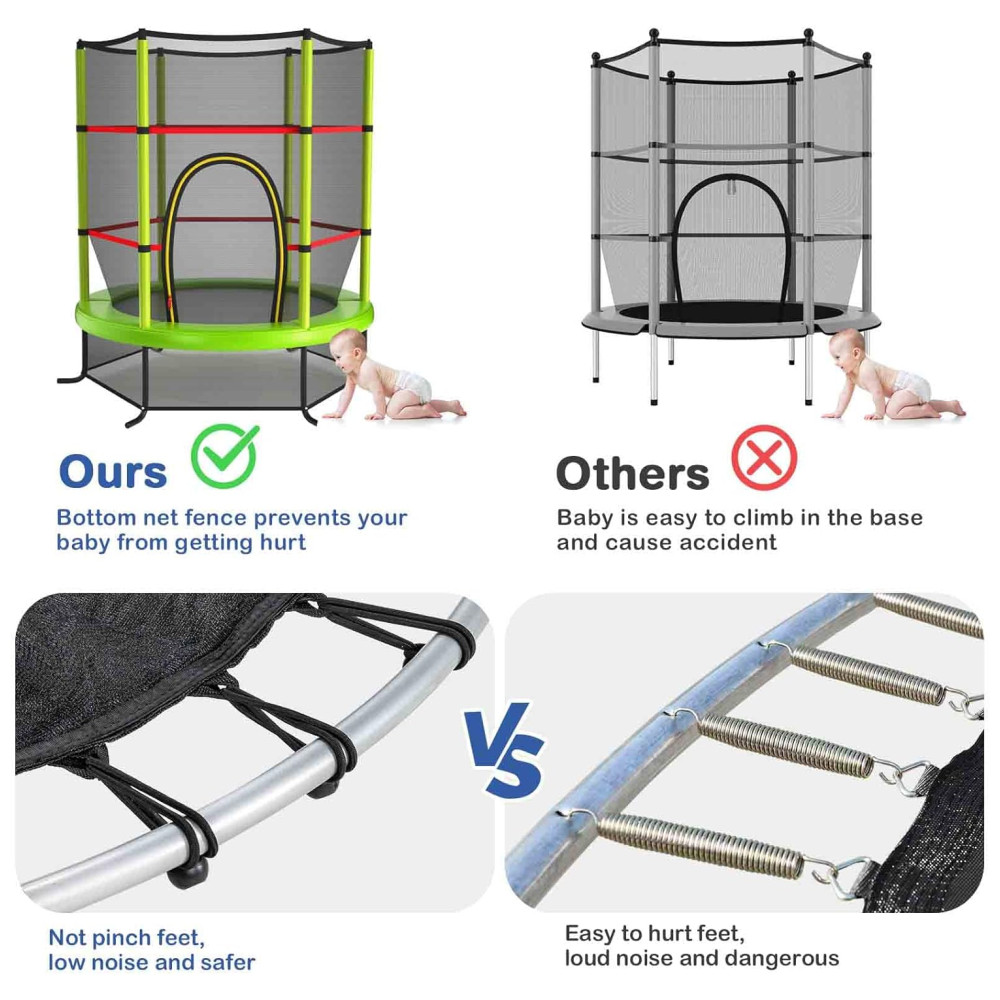 Estrutura acolchoada protetora Com rede de segurança completa, o trampolim infantil lhe dará a confiança necessária para deixar seu filho pular em paz. E o tubo de espuma pode proteger seu filho de lesões, garantindo a segurança total de seus filhos pequenos. Perfeito para exercícios infantis A rede do gabinete tem uma porta com zíper para as crianças entrarem e saírem. Com seu design transparente, você pode ficar de olho em seus filhos enquanto faz outras coisas. A rede inferior também mantém os seus filhos afastados do espaço. Enquanto isso, as pernas estendidas podem aumentar a estabilidade e evitar tombamento para garantir segurança extra. Construção estável e durável Feito de tubo de aço galvanizado no interior, o trampolim infantil é sólido e estável o suficiente para suportar até 300 libras. E a superfície galvanizada é resistente à ferrugem, aumentando a resistência, o que é de grande durabilidade com longo tempo de serviço. Fácil de montar Nosso trampolim infantil é equipado com 30 cordas de tensão, que tem boa elasticidade, permitindo que as crianças pulem mais alto. Enquanto isso, as cordas de tensão não são fáceis de deformar para uso a longo prazo e facilitam a instalação. Com um peso líquido de apenas 24 libras, o trampolim pode ser facilmente movido para onde você quiser. Construído com detalhes atenciosos O tapete de salto em PP antiderrapante e resistente ao desgaste e a almofada de segurança em PVC podem fornecer excelente desempenho de salto, o que faz com que seu filho se sinta um exercício emocionante e divertido. E também pode ajudar seu filho a desenvolver um senso de coragem e melhorar as habilidades de equilíbrio, o que é especialmente benéfico para seu filho