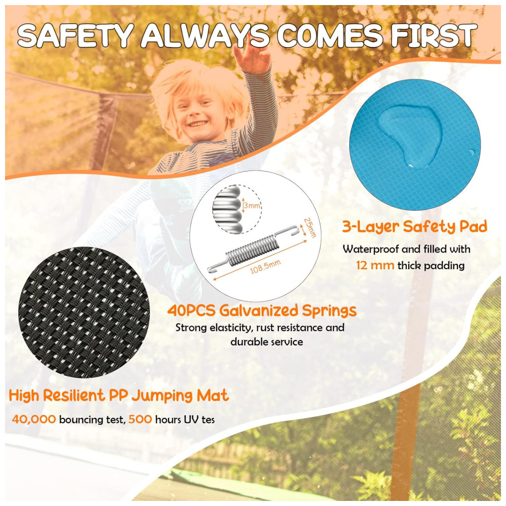 Aprovado pela ASTM Passou no teste para reivindicações relacionadas aos padrões ASTM, oferecendo a você uma compra mais confiável e dando às crianças um acompanhamento de crescimento mais . O trampolim infantil multifuncional GYMAX Design 3 em 1 possui balanço removível e barra horizontal, oferecendo mais opções de jogo. Com este pequeno trampolim, o seu filho vai se divertir pulando, balançando ou até praticando ginástica. Almofada protetora sem costura Molas elásticas altas O tapete de salto e a almofada de segurança são costurados juntos, deixando você sem preocupações em se machucar por molas ou ficar preso na lacuna. O tapete de salto é firmemente conectado à estrutura com molas de alta resistência de 40 unidades, que medem 108, x com diâmetro de fio de . Proteção de segurança abrangente Todos os postes de rede são adotados com cobertura de espuma espessa de , que é de alta densidade e macia, protegendo as crianças de se machucarem em colisões. Todos os lados deste trampolim retangular são cobertos com uma rede de proteção. A entrada em forma de L maximiza o espaço de entrada enquanto os zíperes e fivelas de cabeça dupla evitam qualquer acidente. Melhor aproveitamento do espaço Este trampolim retangular exclusivo 75 x 49 foi projetado para fornecer maior área de salto e ocupar menos espaço, perfeito para espaços pequenos, como apartamentos ou condomínios. Enquanto isso, este trampolim infantil também é adequado para atividades ao ar livre, e você pode transformar seu quintal em um parque temático de salto particular. Durável para longa vida útil A estrutura do trampolim infantil GYMAX é feita de aço resistente com galvanização dupla face para resistência à ferrugem e ao desgaste. As molas também são galvanizadas e os tubos dos pés são tratados com revestimento em pó adicional para prolongar a vida útil. O tapete de salto PP de alta resiliência passou no teste de salto de 40.000 e no teste UV de 500 horas. Fácil montagem Configure este mini trampolim com principalmente 6 degraus e todos os acessórios e ferramentas necessários estão incluídos