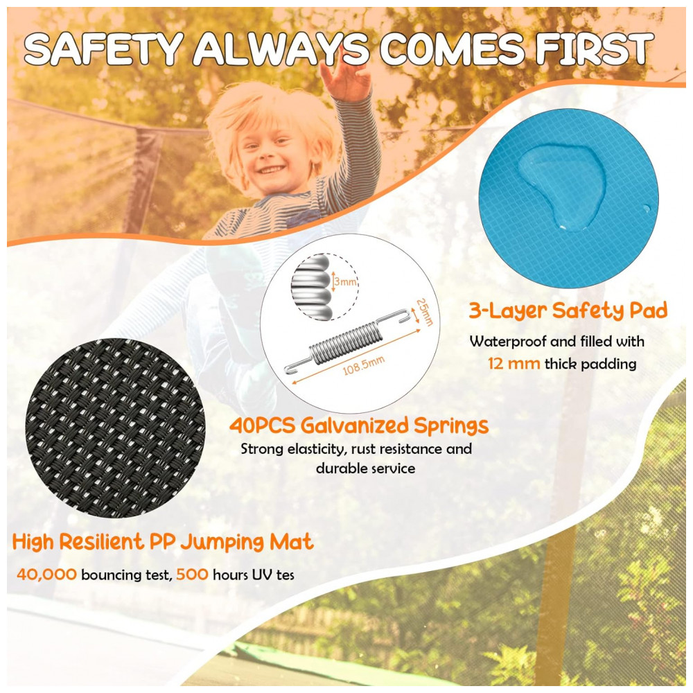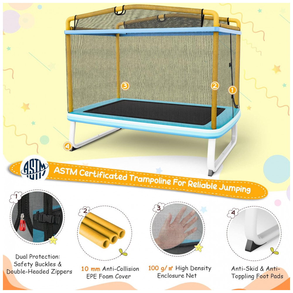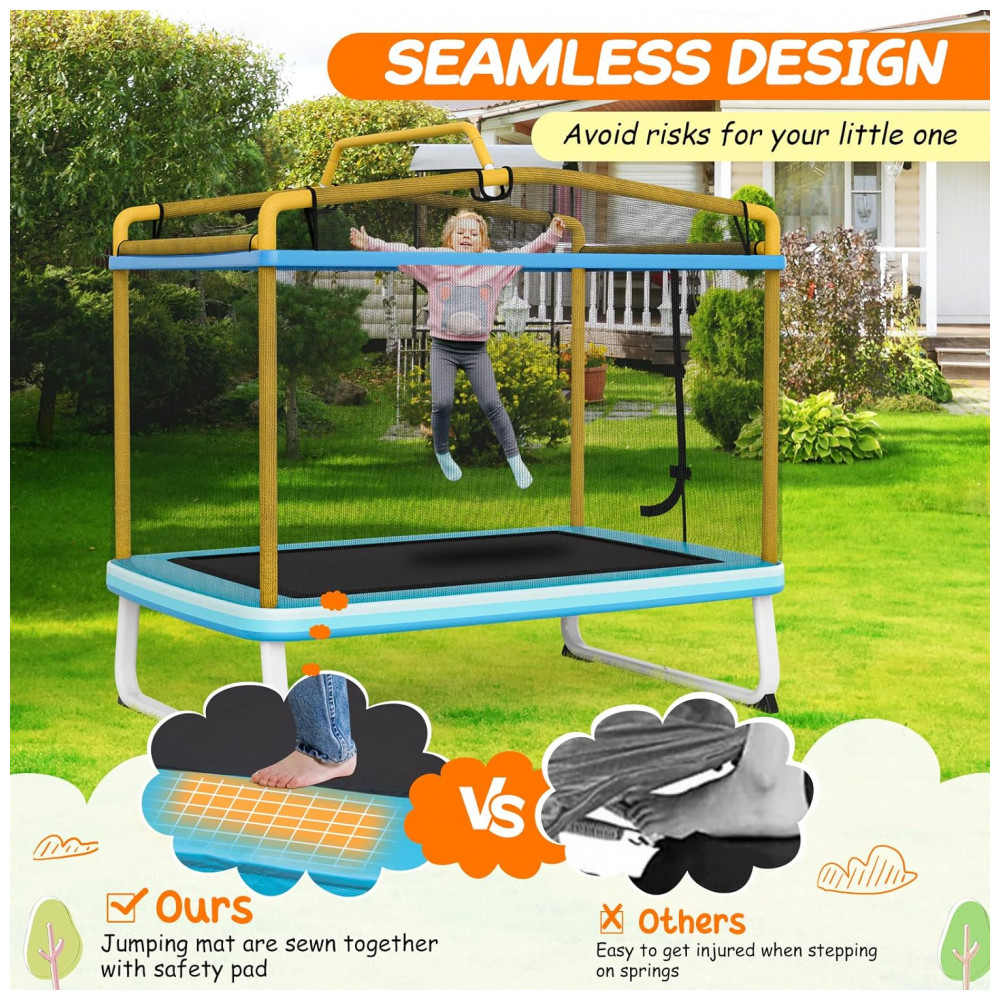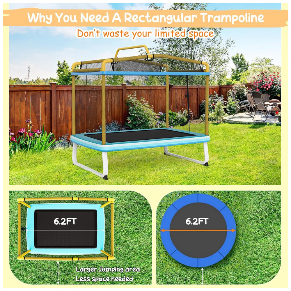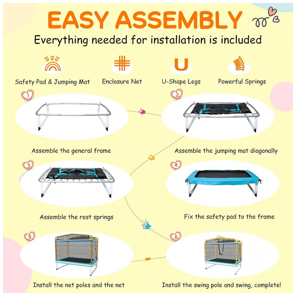 Aprovado pela ASTM Passou no teste para reivindicações relacionadas aos padrões ASTM, oferecendo a você uma compra mais confiável e dando às crianças um acompanhamento de crescimento mais . O trampolim infantil multifuncional GYMAX Design 3 em 1 possui balanço removível e barra horizontal, oferecendo mais opções de jogo. Com este pequeno trampolim, o seu filho vai se divertir pulando, balançando ou até praticando ginástica. Almofada protetora sem costura Molas elásticas altas O tapete de salto e a almofada de segurança são costurados juntos, deixando você sem preocupações em se machucar por molas ou ficar preso na lacuna. O tapete de salto é firmemente conectado à estrutura com molas de alta resistência de 40 unidades, que medem 108, x com diâmetro de fio de . Proteção de segurança abrangente Todos os postes de rede são adotados com cobertura de espuma espessa de , que é de alta densidade e macia, protegendo as crianças de se machucarem em colisões. Todos os lados deste trampolim retangular são cobertos com uma rede de proteção. A entrada em forma de L maximiza o espaço de entrada enquanto os zíperes e fivelas de cabeça dupla evitam qualquer acidente. Melhor aproveitamento do espaço Este trampolim retangular exclusivo 75 x 49 foi projetado para fornecer maior área de salto e ocupar menos espaço, perfeito para espaços pequenos, como apartamentos ou condomínios. Enquanto isso, este trampolim infantil também é adequado para atividades ao ar livre, e você pode transformar seu quintal em um parque temático de salto particular. Durável para longa vida útil A estrutura do trampolim infantil GYMAX é feita de aço resistente com galvanização dupla face para resistência à ferrugem e ao desgaste. As molas também são galvanizadas e os tubos dos pés são tratados com revestimento em pó adicional para prolongar a vida útil. O tapete de salto PP de alta resiliência passou no teste de salto de 40.000 e no teste UV de 500 horas. Fácil montagem Configure este mini trampolim com principalmente 6 degraus e todos os acessórios e ferramentas necessários estão incluídos