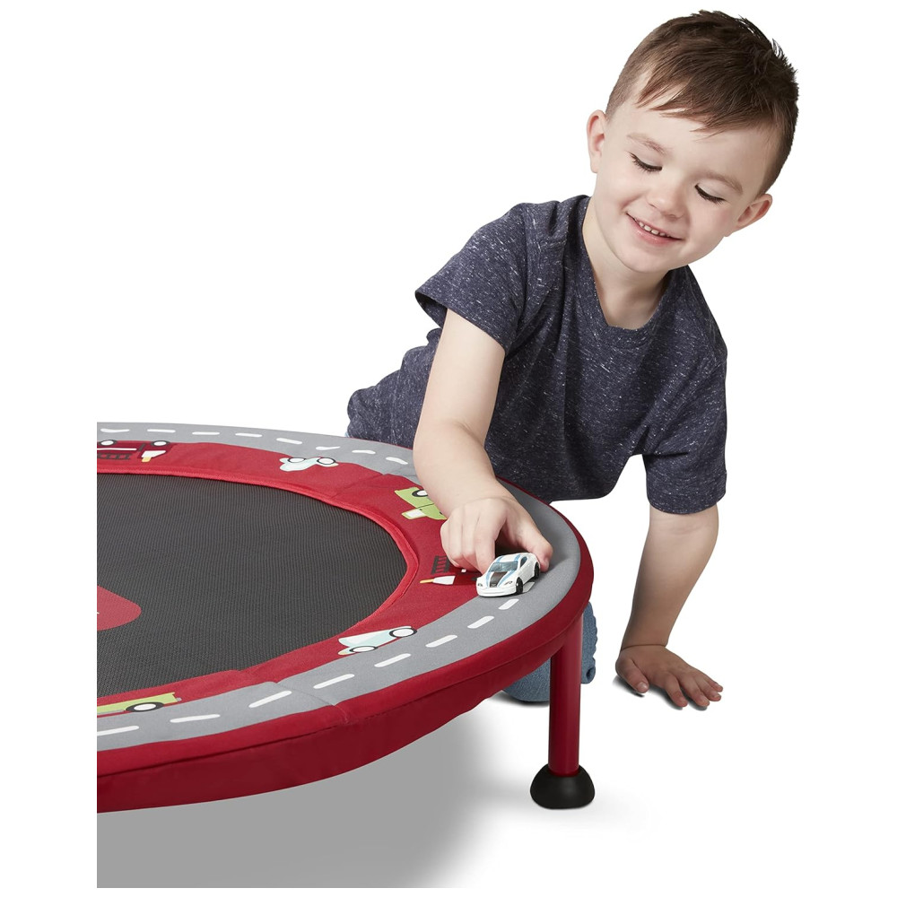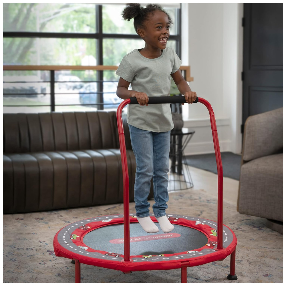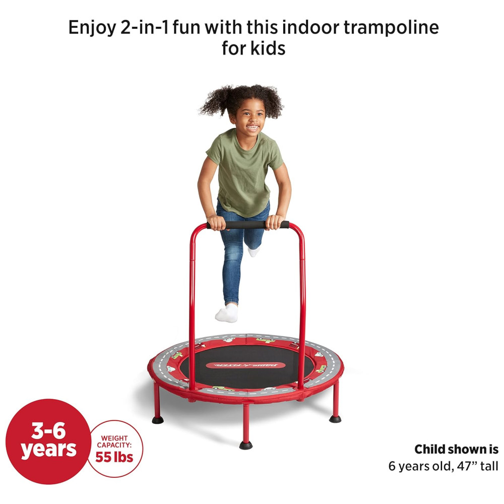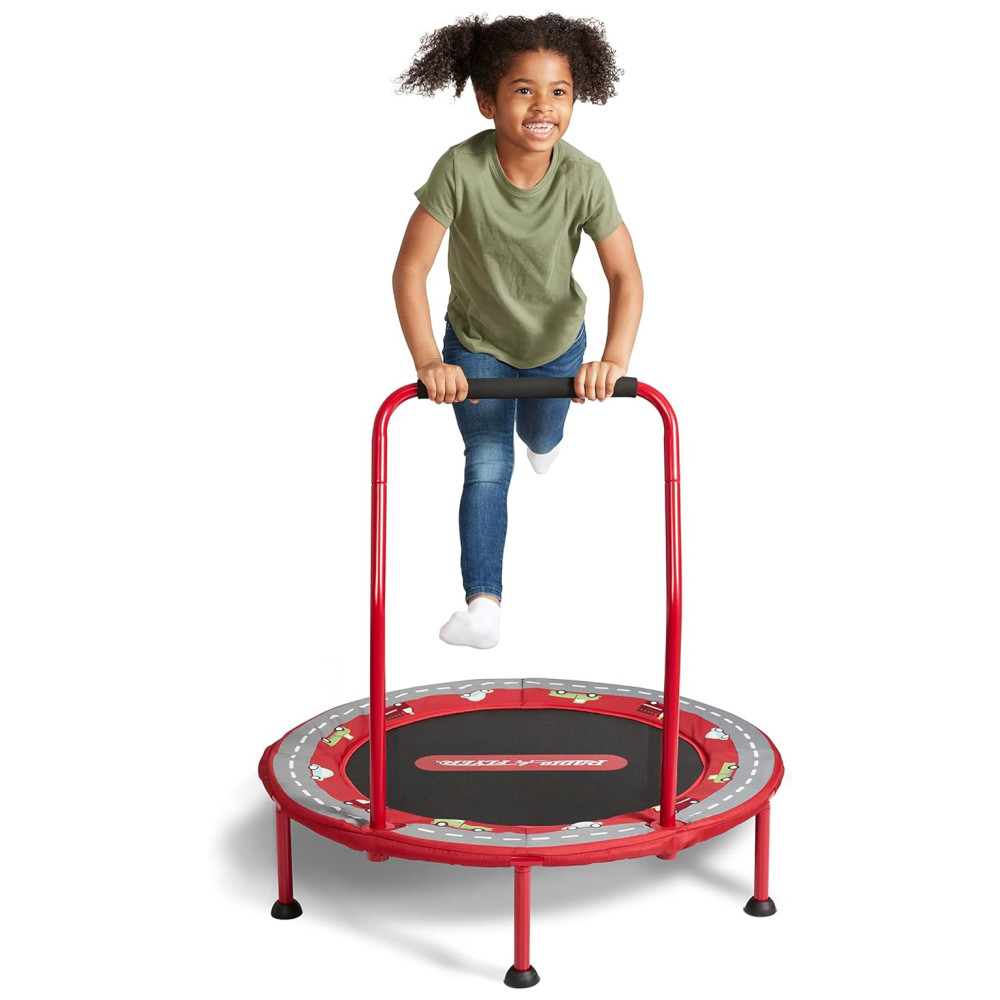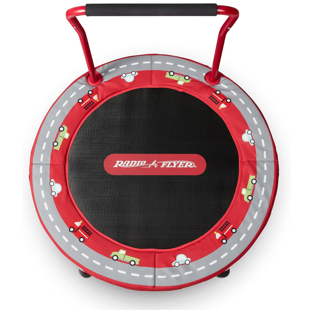 O trampolim infantil 2 em 1 é uma ótima opção de brinquedo para crianças. Além da área de salto larga e durável, ele também funciona como um tapete de brincar com um divertido tema de pista de corrida. A alça resistente apresenta uma empunhadura macia e confortável para diversão contínua. Este trampolim para crianças ajuda a desenvolver habilidades motoras grossas e equilíbrio. A alça de estabilidade dobra se para armazenamento rápido e fácil. As dimensões do produto são 91,01 cm x 91,01 cm x 92,00 cm, é recomendado para crianças de 36 meses e possui capacidade máxima de peso de 24,94 Quilos. A Radio Flyer é uma Certified B Corp, atendendo aos mais altos padrões de desempenho social e ambiental verificado, transparência e responsabilidade. Eles criam produtos duradouros que inspiram brincadeiras ativas e criam memórias calorosas, dedicando se a preservar a Terra para as gerações futuras.