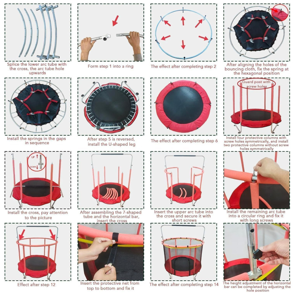 O trampolim possui altura ajustável de 3 níveis do design de altura da barra horizontal, que pode ser removida quando não for necessária, e a parte superior é fornecida com um selo de segurança para as crianças brincarem com tranquilidade. Pode ser ajustado de 59 polegadas a 60 ou 62 polegadas.