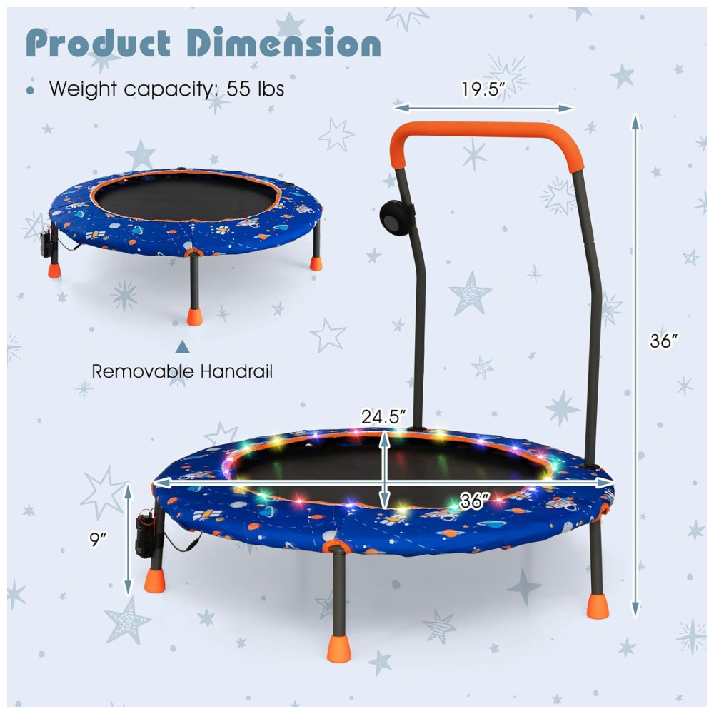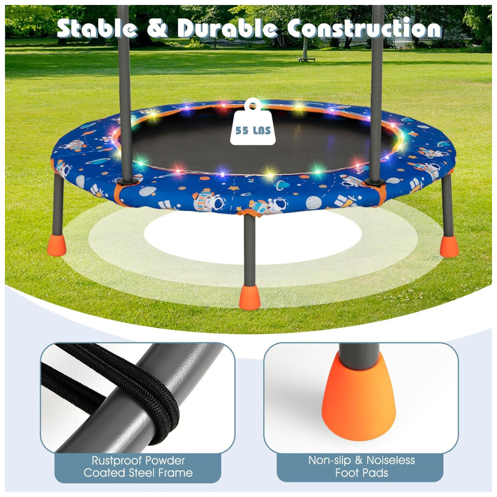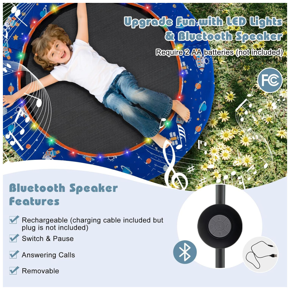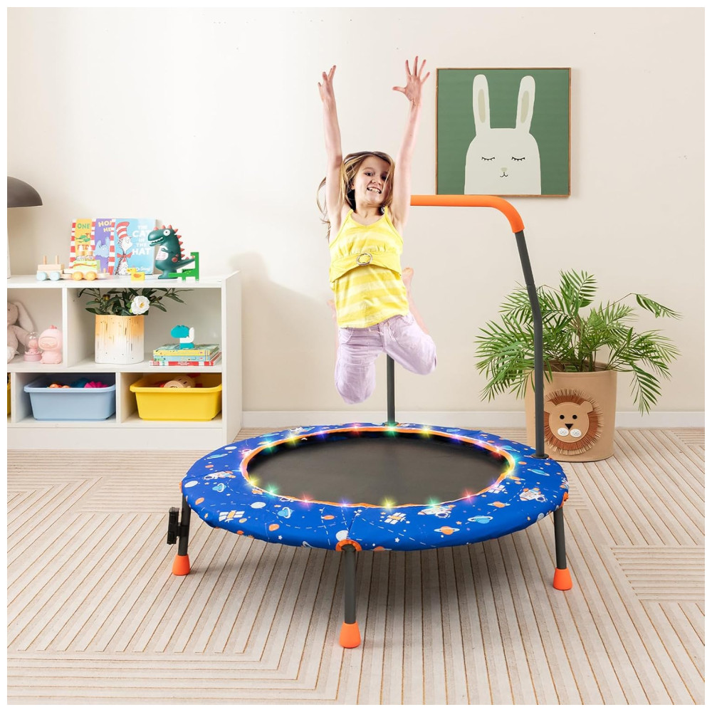 Trampolim infantil Goplus 36 com luzes LED Bluetooth e alça removível Capa inclusa.