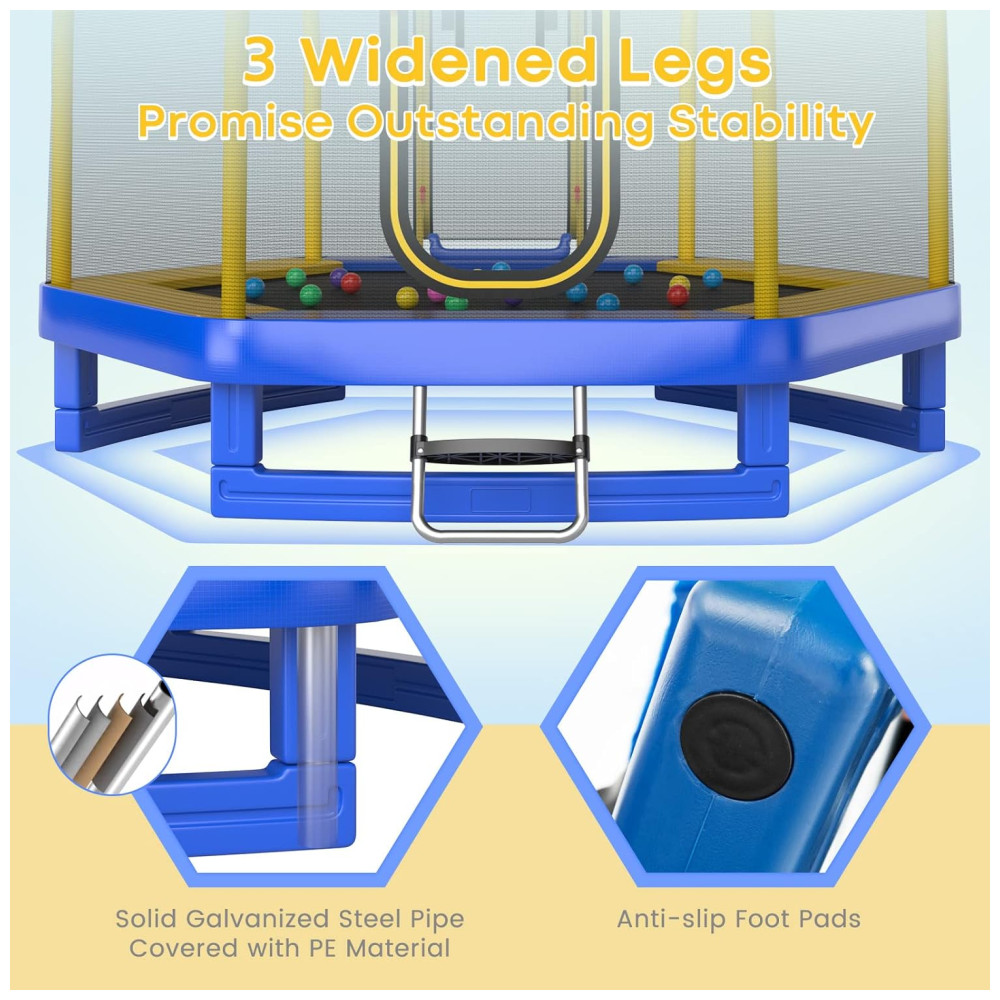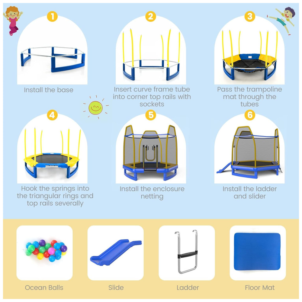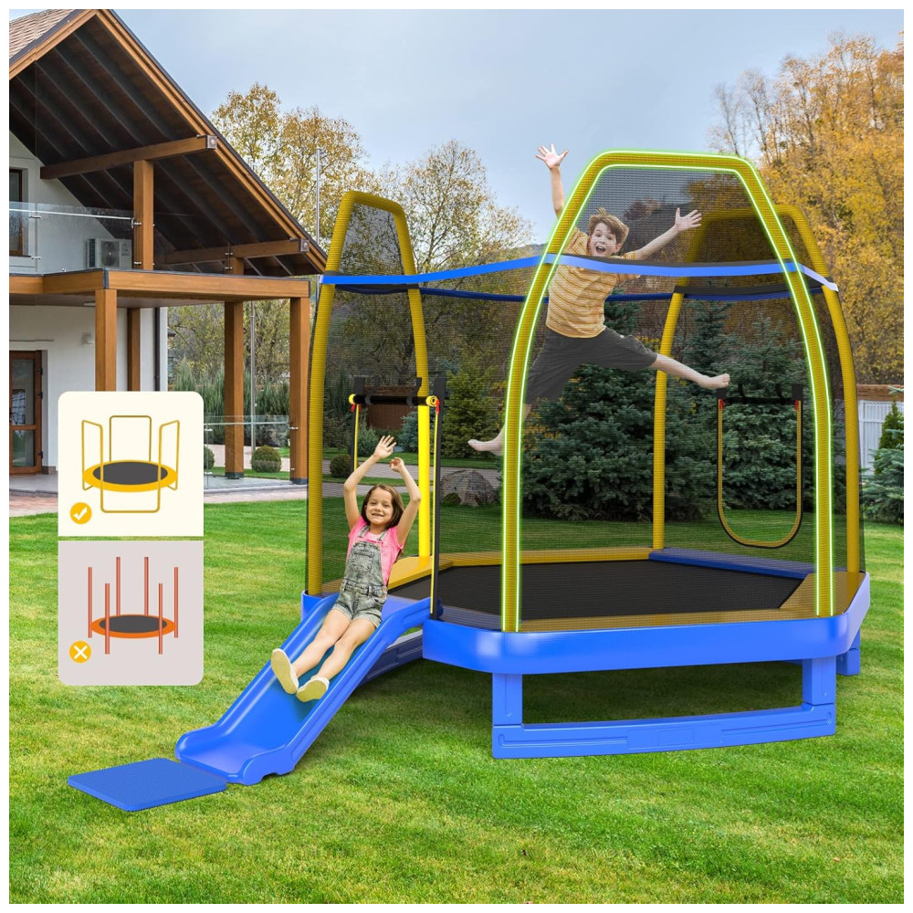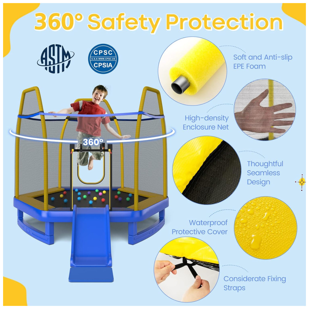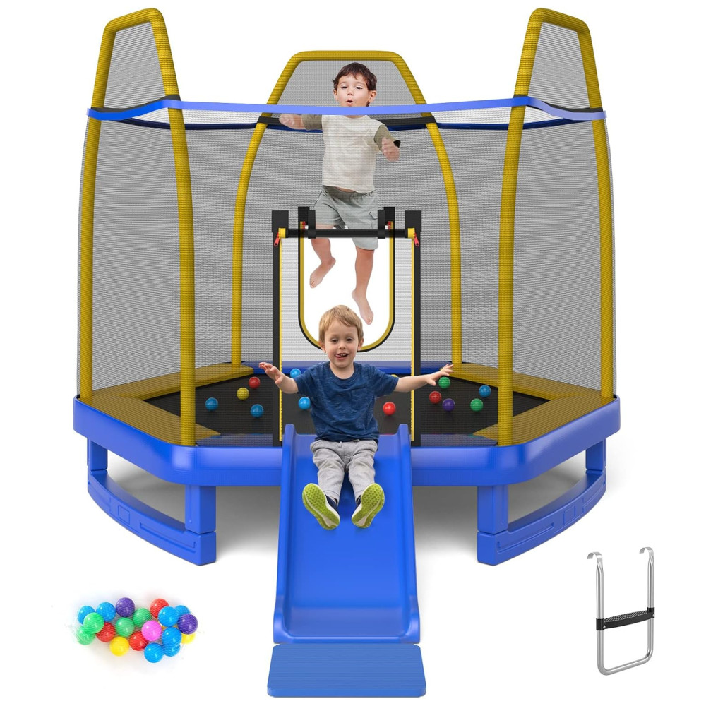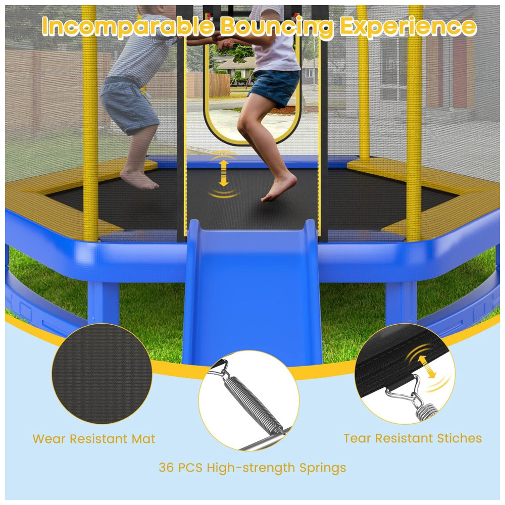 Trampolim infantil Goplus 7 FT com escorregador trampolim recreativo aprovado pela ASTM 87 com estrutura de aço galvanizado rede de segurança escada trampolim interno externo para crianças azul amarelo