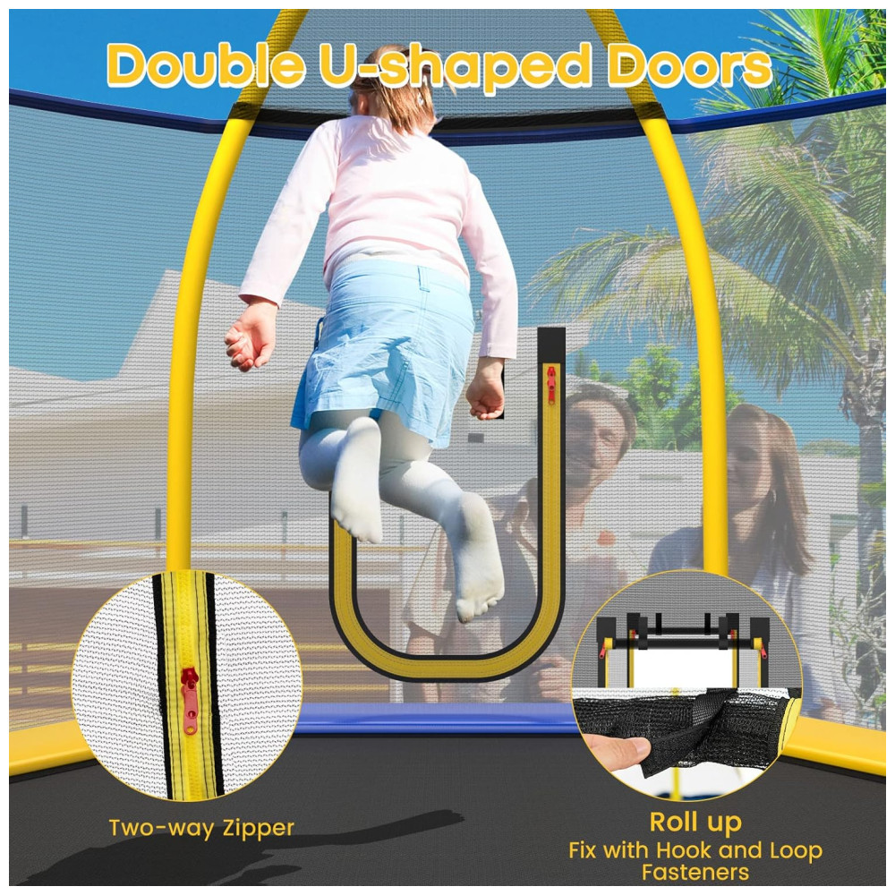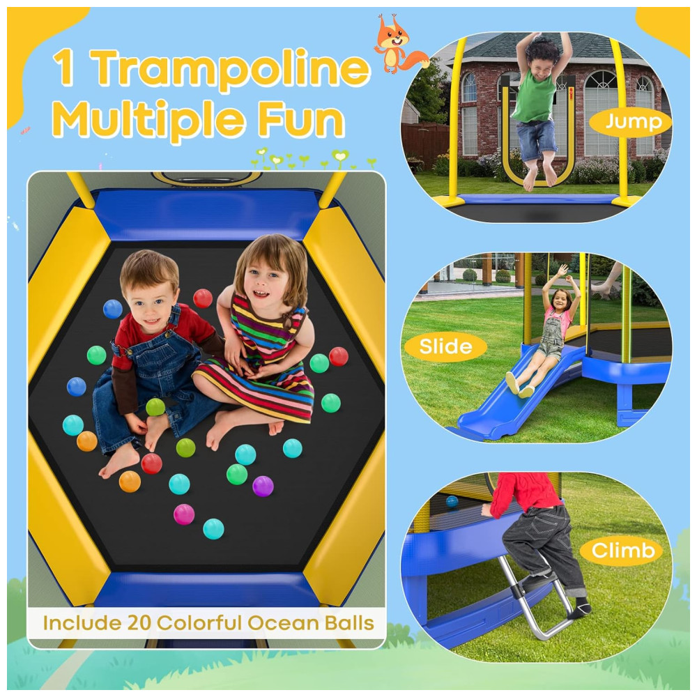 Descrição Dê às crianças uma infância inesquecível com nosso trampolim 7 com escorregador e escada. Este trampolim recreativo combina as funções de trampolim, escorregador e escada. Os tubos de aço galvanizado por imersão a quente oferecem suporte forte e suportam até 600 libras 270 kg. Enquanto isso, a rede do gabinete de alta densidade oferece proteção de 360 graus. Com 2 portas em forma de U com zíperes bidirecionais, as crianças podem entrar e sair facilmente. Além disso, a espuma EPE macia e a almofada protetora com design perfeito são adequadas para a pele delicada das crianças. Além disso, as crianças podem saltar confortavelmente graças ao tapete de salto em PP antiderrapante e respirável. E o trampolim infantil de 7 pés é adequado para uso interno e externo. Características Vem com 20 bolas oceânicas e um tapete Inclui o trampolim, a escada e a lateral para diversão múltipla 3 pernas robustas em forma de U para estabilidade geral Tubos de aço galvanizado por imersão a quente cobertos com material PE para estabilidade Portas duplas com zíper em forma de U para fácil acesso PP resistente ao desgaste tapete de salto para melhor experiência de salto Molas de alta resistência de 36 peças para fixação firme Rede de segurança 360 para proteção total Espuma EPE macia e design sem costura protegem a pele delicada das crianças Almofadas antiderrapantes para proteção do chão e estabilidade extra Especificações Cor Verde Amarelo Azul Amarelo Materiais Galvanizado Aço, PP, PVC, PE, EPE Dimensão do trampolim 7,3 x 7,3 x 6,1 pés 223 x 223 x C x L x A Tamanho do escorregador 15,5 x 17 39,5 x 42, L x A Tamanho da escada 18 x 13 45 x C x L Tamanho do tapete 15,5 x 12 39 x 30, C x L Peso líquido 63 libras 29 kg Capacidade de peso 600 libras 270 kg Idades recomendadas 3 anos O pacote inclui 1 x trampolim 20 x bolas do oceano 1 x tapete 1 x Instrução1 Trampolim, Divertimento Múltiplo Este trampolim infantil de 7,3 pés é composto por um trampolim, escorregador e escada. E 20 bolas coloridas do oceano estão incluídas. Assim, o trampolim infantil cria um local para as crianças pularem, deslizarem e escalarem, durante o qual podem vivenciar a diversão de diversos jogos. A segurança aprovada pela ASTM está em primeiro lugar A rede de proteção elevada em 360 graus com portas com zíper e tubos acolchoados com espuma oferece proteção total para as crianças, para que possam pular com segurança. Além disso, as crianças podem entrar e sair facilmente do trampolim com as 2 portas em forma de U. O tapete fornecido oferece amortecimento quando as crianças escorregam. Construção Reforçada Apoiado pela robusta estrutura de aço galvanizado por imersão a quente e tubos de aço espessos de 1,, o trampolim para crianças transporta até 600 libras 270 kg. Além disso, as 3 pernas alargadas em forma de U com almofadas antiderrapantes contribuem para maior estabilidade. Experiência de salto incomparável Com um tapete de salto PP premium, as crianças podem ter uma experiência de salto melhor. Além do mais, as molas de alta resistência de 36 PCS, bem como os pontos resistentes a rasgos garantem segurança. O design perfeito entre o tapete de salto e a capa protetora evita que as mãos e os pés das crianças fiquem presos. Adequado para uso interno e externo O trampolim de 87 polegadas permite que 2 a 3 crianças brinquem simultaneamente. É um presente perfeito para crianças com mais de 3 anos. Além disso, o trampolim passou no teste UV de 5.000 horas do tapete de salto e no teste UV de 500 horas da cobertura de mola. E você pode optar por colocar este trampolim dentro ou fora, onde as crianças poderão se divertir por horas com seus parceiros