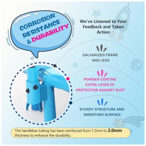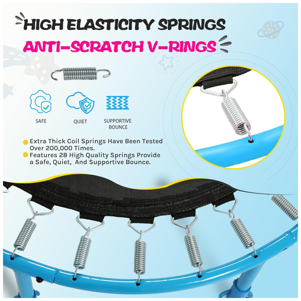 O trampolim SkyBound Mini é perfeito para quem busca diversão com segurança. Com uma almofada de segurança de PVC espessa, molas helicoidais extra grossas, 7 pernas para proteção adicional e um guiador de aço galvanizado coberto de espuma, a segurança é garantida. Além disso, pular no trampolim ajuda a desenvolver habilidades motoras, coordenação olho mão e equilíbrio. O trampolim pode ser usado tanto ao ar livre quanto dentro de casa, graças aos seus pés revestidos de borracha e resistentes à água, que são fáceis de remover e limpar, sem danificar ou sujar o chão. É o primeiro trampolim ideal para crianças pequenas, com um design exclusivo e adorável que cria uma vibração calorosa e doce. Não há menções à garantia ou suporte.