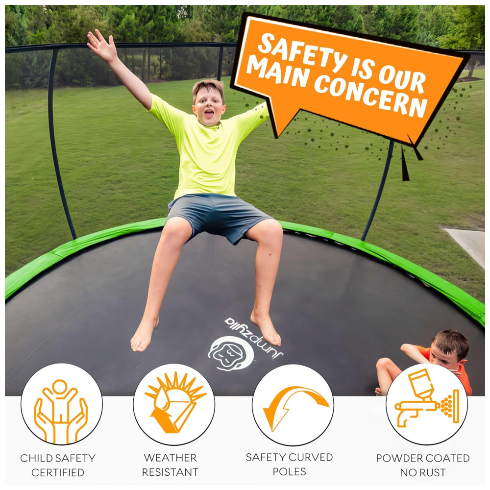 A diversão e segurança do seu filho – Nossa responsabilidade! Para a segurança da sua família, inovamos nossos trampolins para crianças e adultos com postes curvos de última geração, projetados para proteger contra acidentes ou lesões. Os trampolins Jumpzylla atendem à norma de segurança ASTM F381-16. Nunca comprometemos segurança ou qualidade, nossa missão é oferecer um trampolim resistente para horas de diversão sem preocupações.