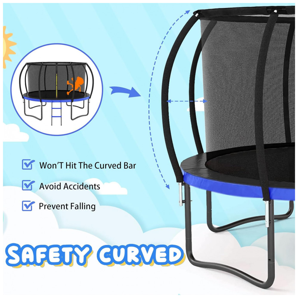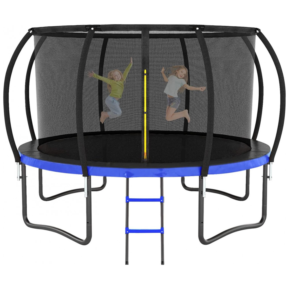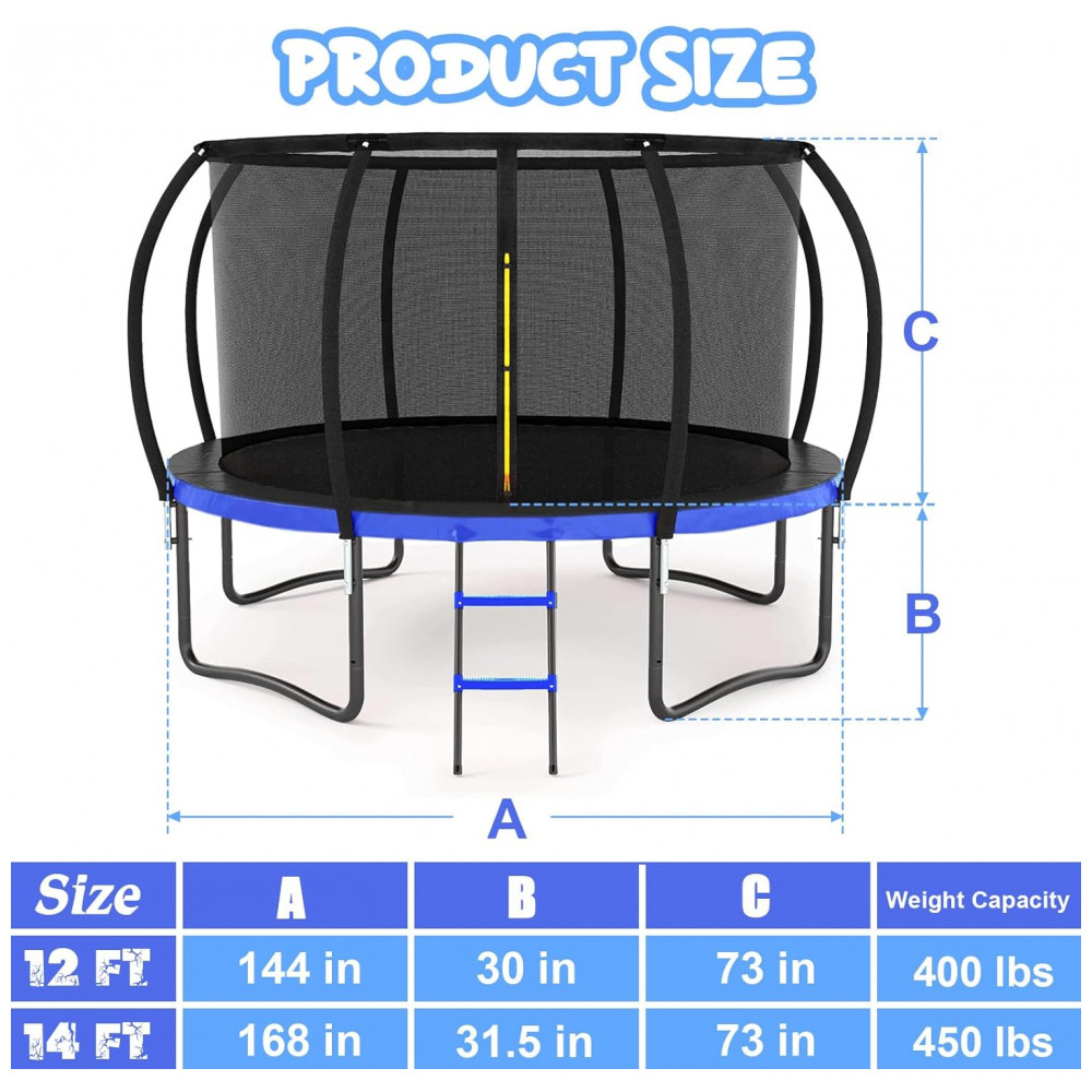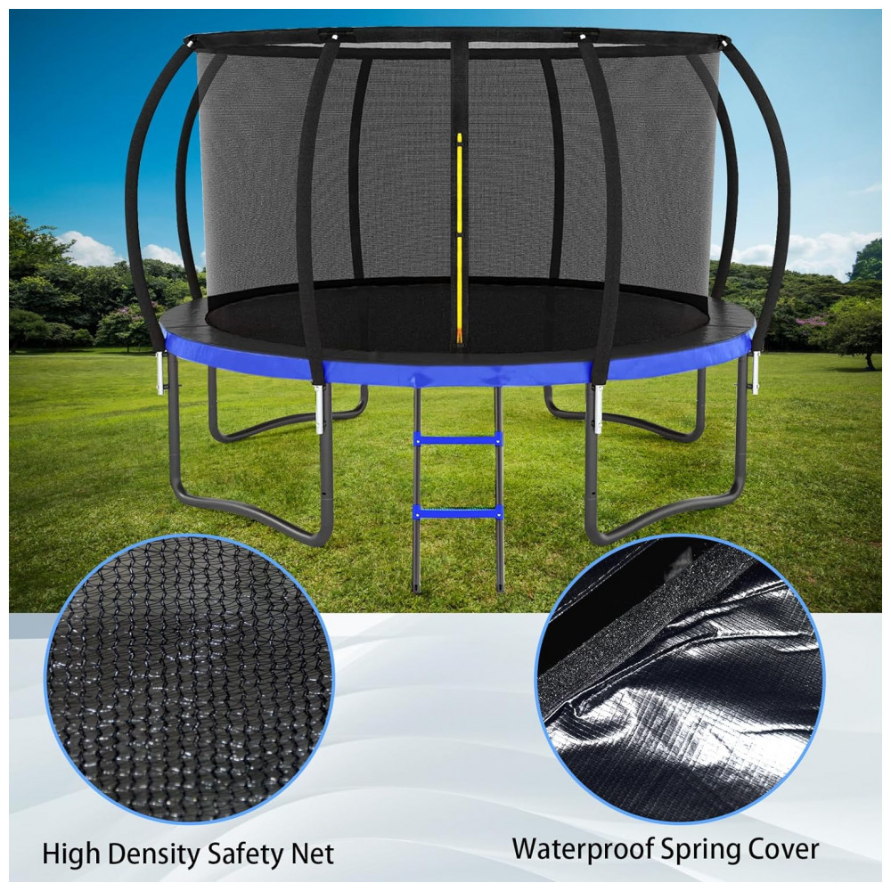 Trampolim Liyarya 12FT 14FT Trampolim para crianças Adultos Trampolins recreativos ao ar livre com postes curvos e escada de rede de gabinete revestimento anti ferrugem de trampolim resistente aprovação ASTM azul 12FT