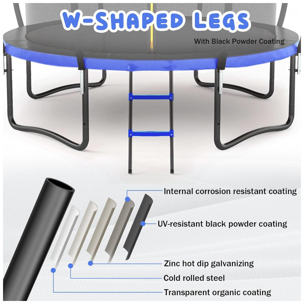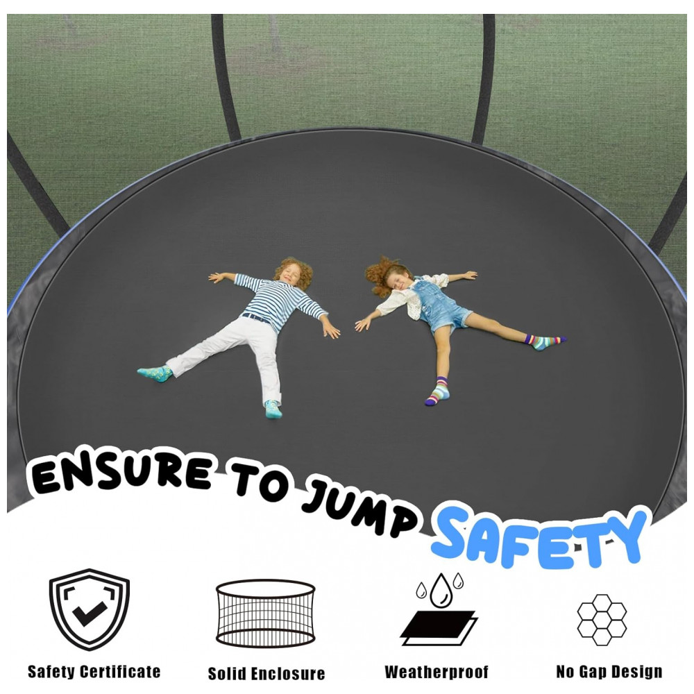 Segurança em primeiro lugar Nada é mais importante do que a segurança dos seus filhos. Nosso trampolim de 12 pés está equipado com 8 postes curvos acolchoados de espuma para proteger seus filhos de se machucarem ao pular. O trampolim infantil está em conformidade com os regulamentos de segurança padrão ASTM F381 16. Estrutura de aço galvanizado anti ferrugem resistente e durável, perna com revestimento em pó preto, cerca de segurança resistente a UV de alta densidade, conectores T e espuma espessada à prova dágua fornecem durabilidade suficiente para garantir trampolim de 12 pés para uso externo de longo prazo por crianças. Excelente salto Com 72 molas galvanizadas anti ferrugem, pernas em formato de 4 W e um tapete de salto PP antiderrapante, nosso trampolim recreativo de 12 pés oferece excelente estabilidade, elasticidade e propriedades de rebote, proporcionando uma experiência de salto emocionante. Basta pular mais alto Alta capacidade de peso Nosso trampolim de 12 pés para crianças e adultos é testado em até 20.000 saltos e os tapetes são testados em até 5.000 horas, podendo suportar até 400 libras. Ótimo para liberar energia e se divertir. Fácil montagem Todas as peças e instruções específicas estão em um pacote, 2 pessoas podem concluir a instalação do trampolim externo de 12 pés em 1 hora. Comece a pular feliz agora mesmo