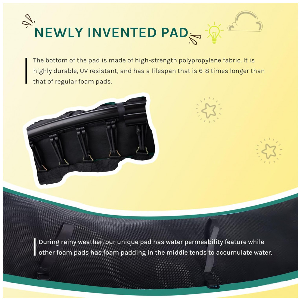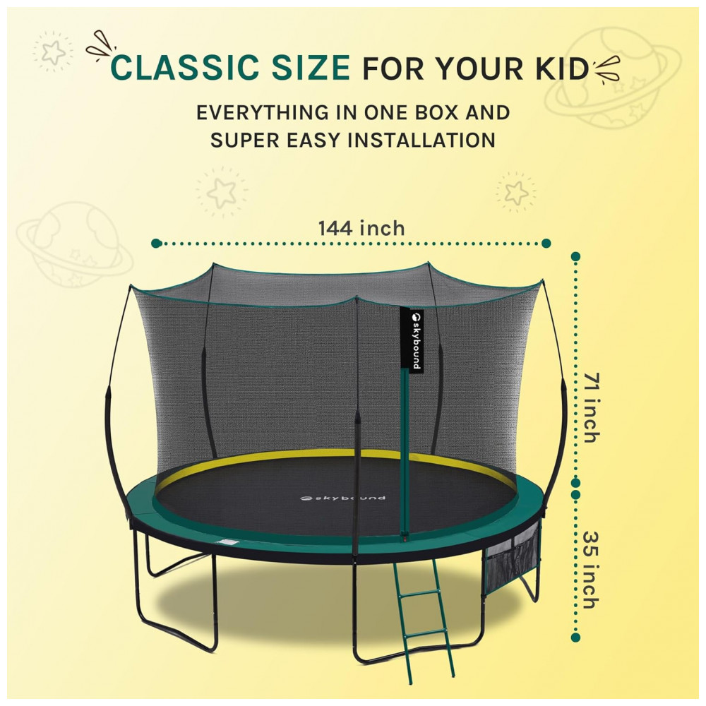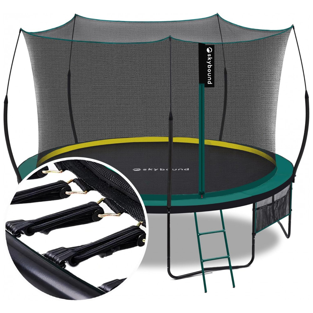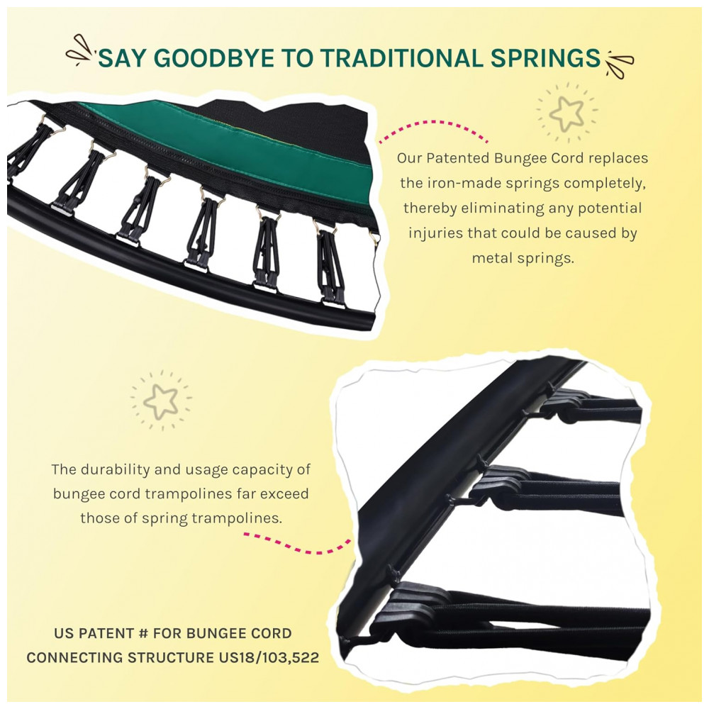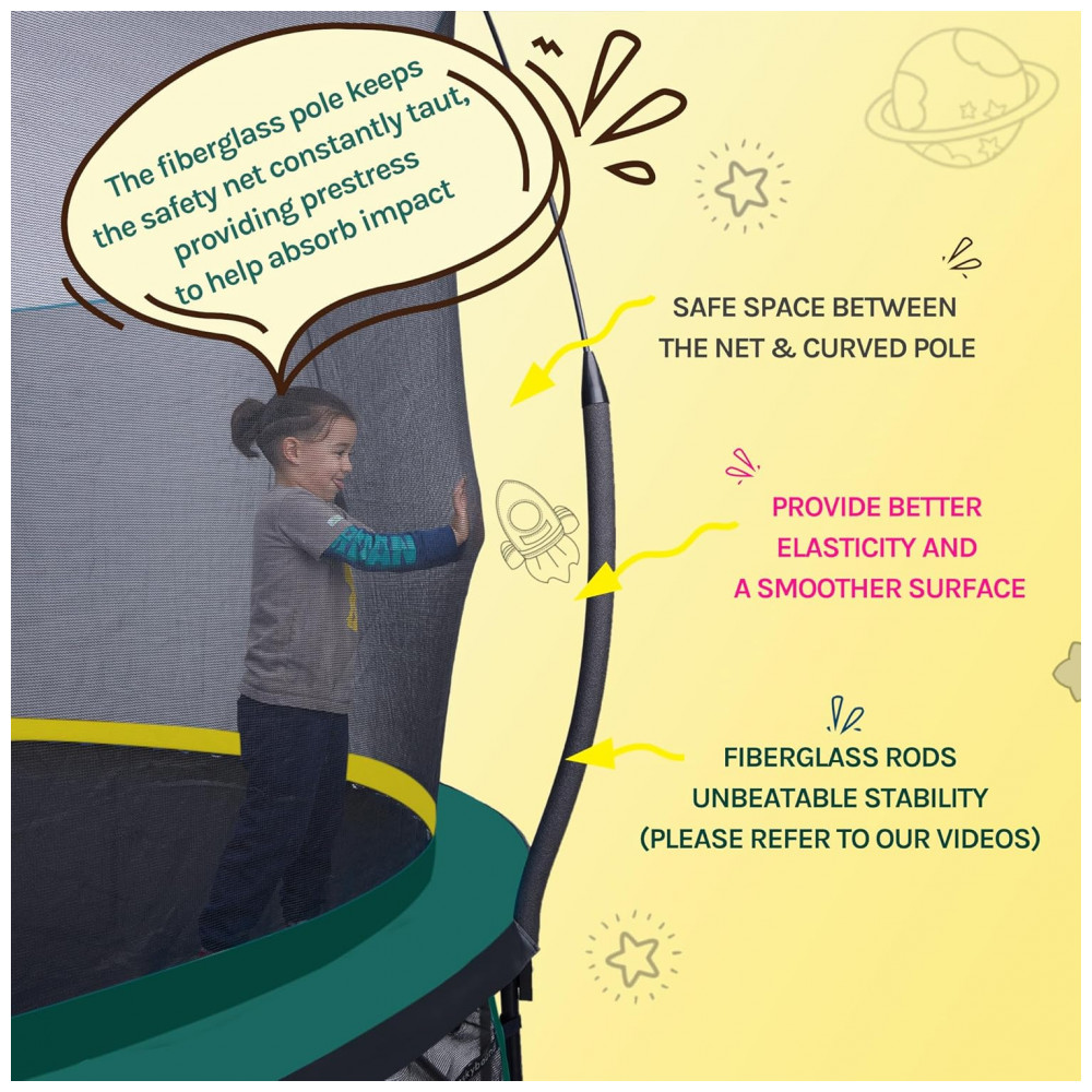 Para a segurança de seus filhos, garantimos que o trampolim recreativo SkyBound atenda e exceda as especificações de segurança padrão ASTM. Você pode ficar tranquilo sabendo que nossos materiais de segurança estão entre os melhores do para sua família. Estamos empenhados em fornecer atendimento excepcional ao cliente Cordas elásticas patenteadas, SEM MOLAS Nossos trampolins de 12 pés usam cordas elásticas flexíveis em vez de molas de metal, removendo quaisquer pontos de aperto que possam prender os pés ou dedos dos pés, reduzindo o risco de lesões. Sistema de zíper inteligente, SEM GAP O design inovador do sistema de zíper do nosso trampolim infantil de 12 pés torna a instalação da rede extremamente fácil, ao mesmo tempo que garante uma conexão perfeita entre o tapete e a rede. Almofada recém projetada, POLIPROPILENO DE ALTA RESISTÊNCIA Altamente durável, resistente aos raios UV, permeável à água e tem uma vida útil 6 a 8 vezes maior do que a das almofadas de espuma normais. A almofada é costurada com tiras de alta qualidade na parte inferior, envolvendo firmemente a moldura para evitar que se solte. Hastes de fibra de vidro patenteadas, ESTABILIDADE IMBATÍVEL O material de fibra de vidro é mais durável e flexível em comparação com postes de metal tradicionais e não enferruja, o que significa que os postes não corroerão com o tempo. Muitas lesões podem ser evitadas Tudo em uma caixa, 5 ANOS DE PROTEÇÃO O trampolim SkyBound de 12 pés inclui todas as peças para fácil montagem. Oferecemos garantia de 5 anos para todos os componentes, proporcionando tranquilidade para a segurança e diversão de sua família. O melhor para seus filhos