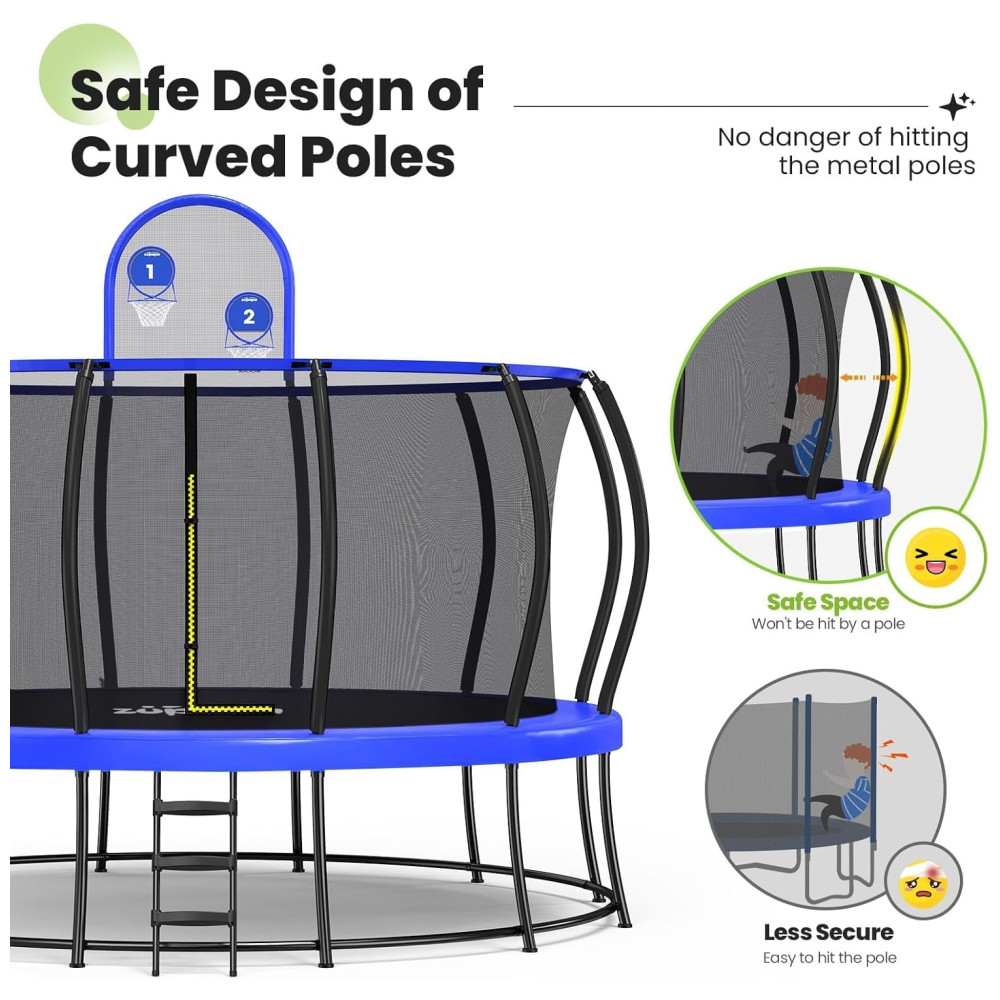 Postes de Rede Curvados e Quantidade Dupla: Os postes curvados para fora, posicionados distantes da rede de proteção, eliminam o risco de colisões com os postes. Com cada perna conectada a um poste, o trampolim possui o dobro de postes em comparação com modelos tradicionais. Esse design distribui o impacto de forma uniforme, reduzindo significativamente o risco de danos ou deformações, garantindo uma experiência de salto sem preocupações.