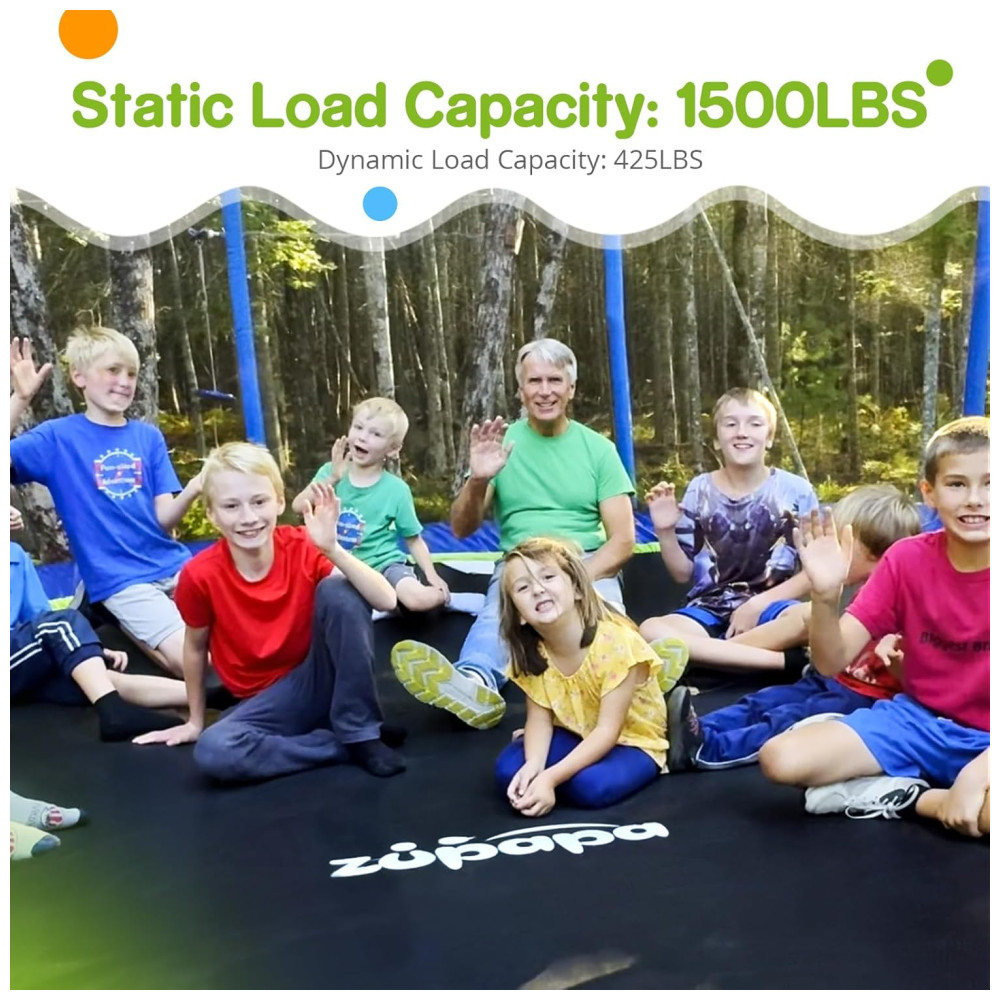 Os trampolins Zupapa são projetadas com o inovador sistema sem lacunas, reduzindo os riscos de acidentes ao manter a capa das molas firmemente costurada ao tapete de salto, aumentando a área útil de saltos. As molas são cobertas com almofadas duráveis para maior segurança.