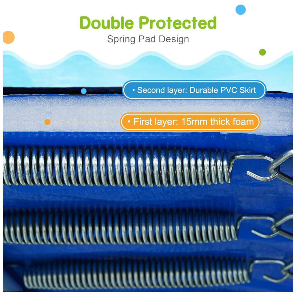 O design inclui 96 molas, oferecendo um salto impressionante. A rede de segurança de 1,8 m de altura, feita de PE ecológico, garante total proteção durante os saltos. Os postes da rede são revestidos com espuma de 10 mm, protegendo as crianças de batidas.