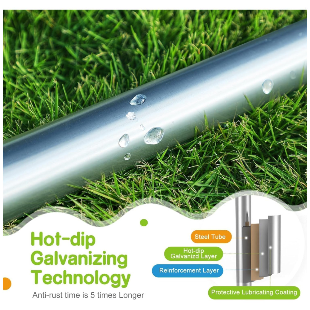 Tecnologia de Galvanização a Quente e Estrutura Reforçada: Utilizando tecnologia de galvanização a quente, os trampolins Zupapa são resistentes à corrosão, com uma vida útil cinco vezes superior aos métodos comuns. A estrutura de aço de 1,5mm é mais resistente, e as estacas de ancoragem garantem estabilidade até mesmo em tempestades. Capacidade de carga estática de 680 kg e dinâmica de 192 kg.