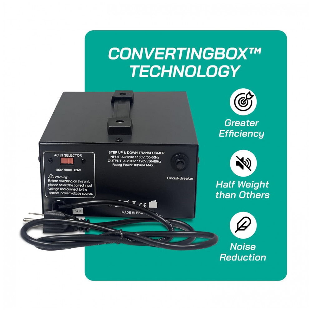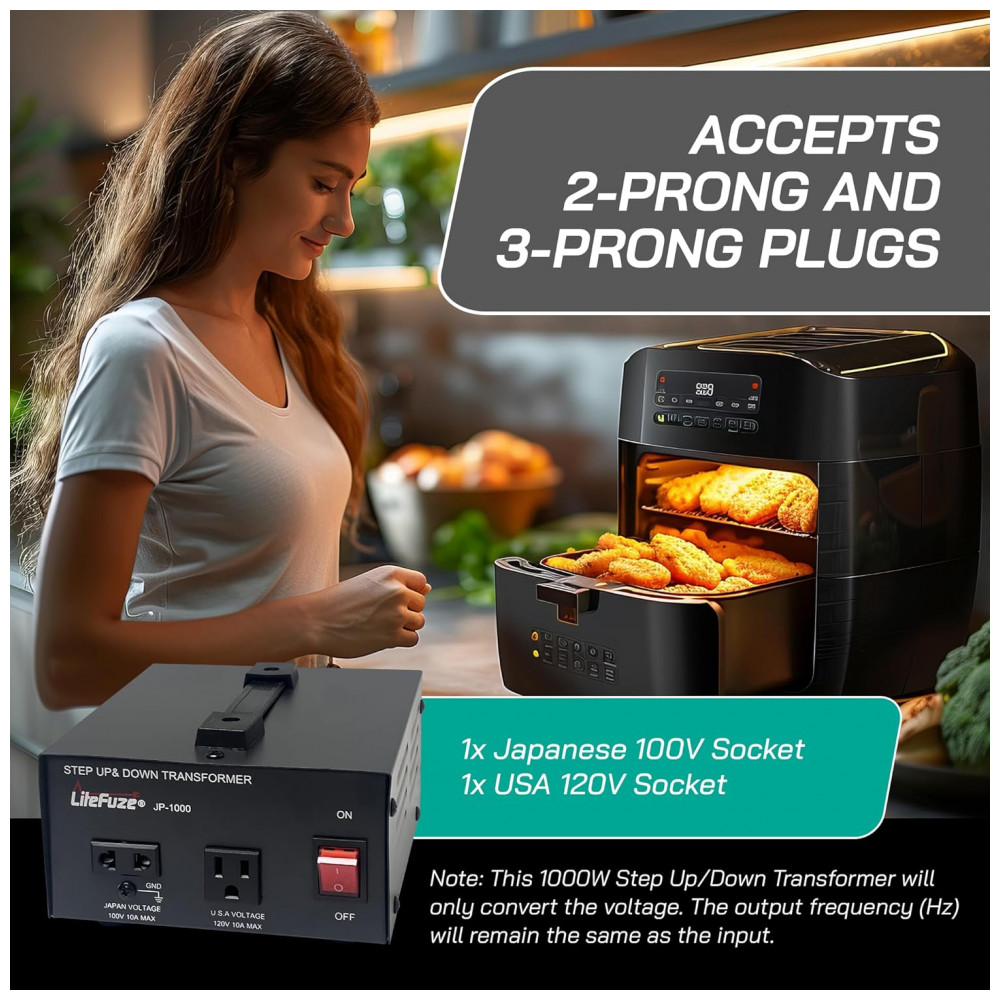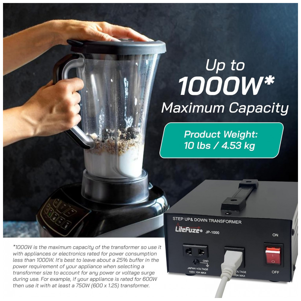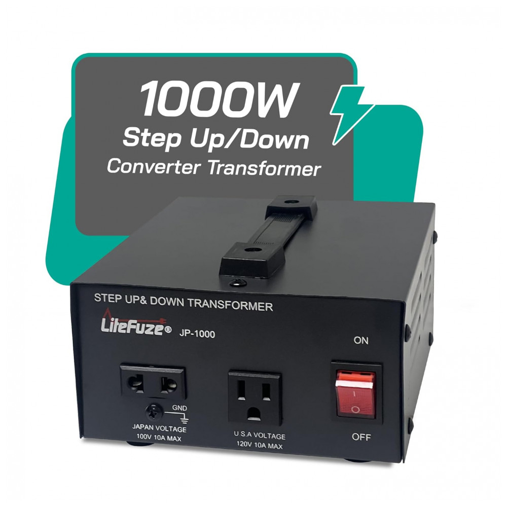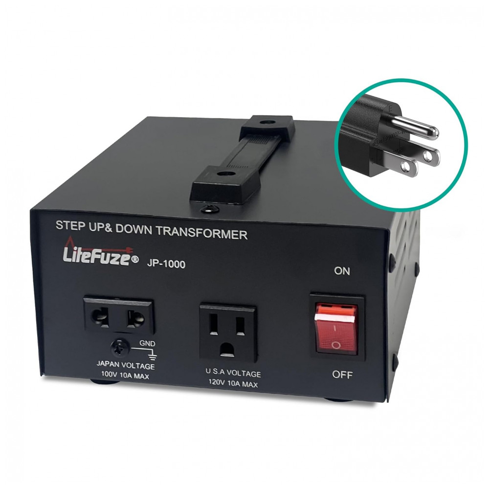 O transformador LiteFuze JP-1000 de 1000W converte voltagem entre padrões japonês 100V e americano 120V, operando como step-up (100V para 120V) para aparelhos japoneses em redes de 120V ou step-down (120V para 100V) para equipamentos de 120V em redes de 100V. Tecnologia ConvertingBox otimiza eficiência da conversão, reduzindo peso e ruído operacional em comparação a transformadores convencionais.