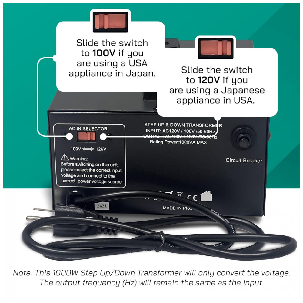Transformador (Conversor) de Voltagem Japonês LiteFuze 1000W Elevação/Redução 100V para 120V/120V para 100V Bobina Cobre Premium Disjuntor Redução Ruído JP-1000.