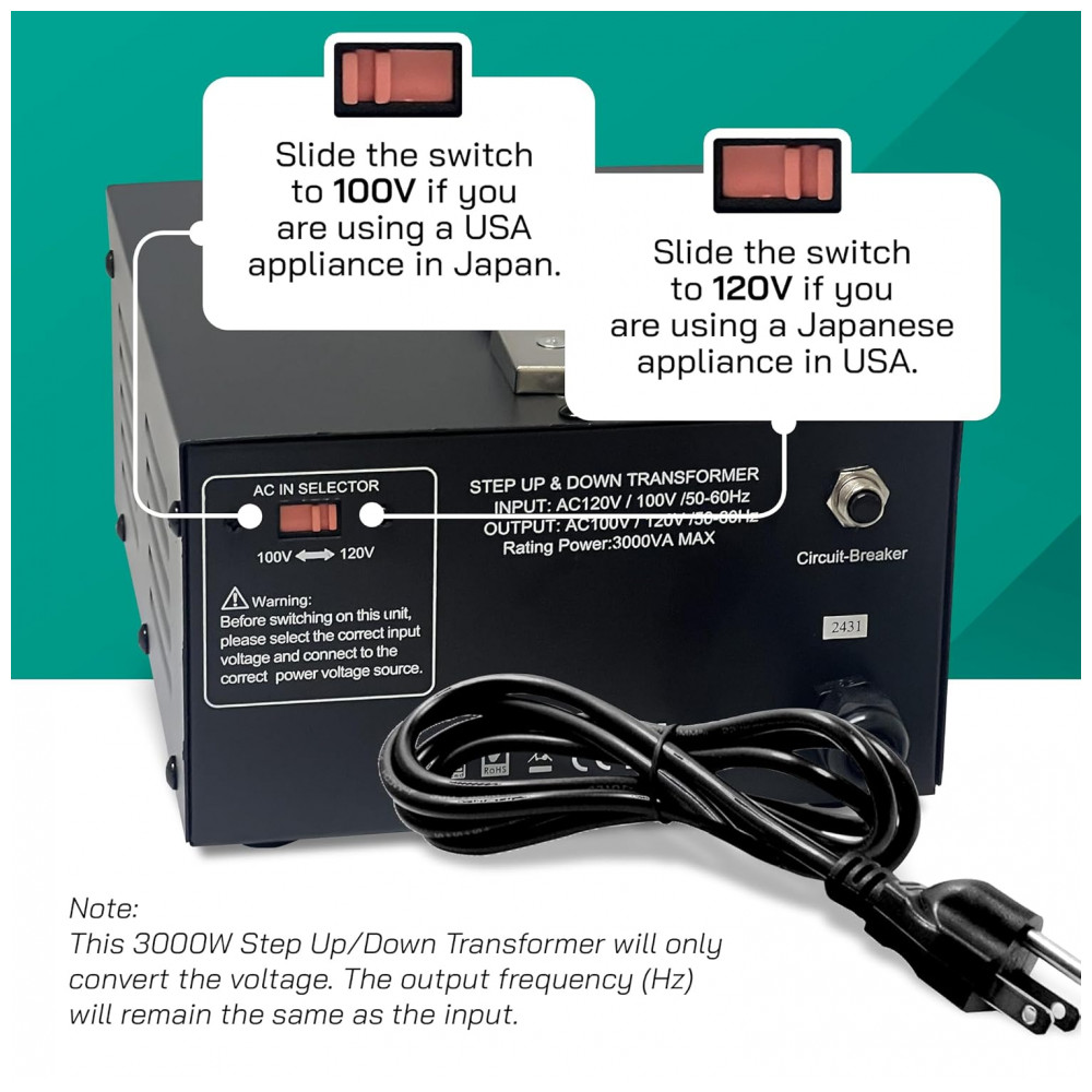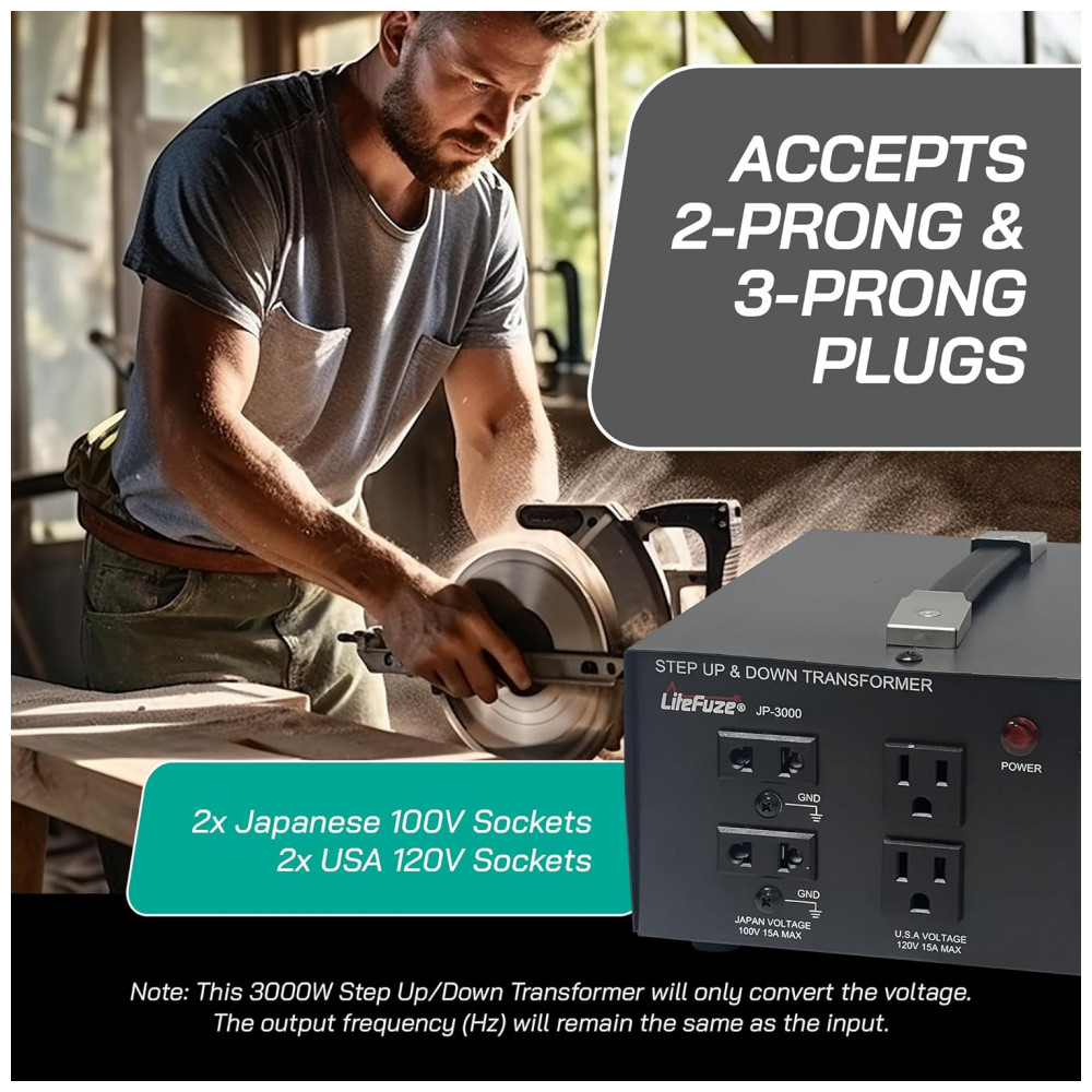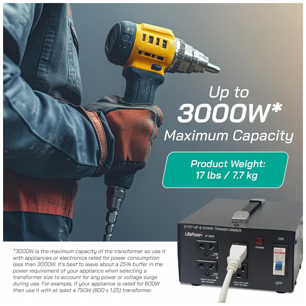 O transformador LiteFuze JP-3000 de 3000W converte eficientemente entre 100V e 120V, funcionando como step-up (100V para 120V) para aparelhos japoneses em redes de 120V ou step-down (120V para 100V) para equipamentos de 120V em redes japonesas de 100V. Equipado com fusível interno que interrompe a corrente em sobrecargas, protege o transformador e os dispositivos conectados contra picos elétricos.