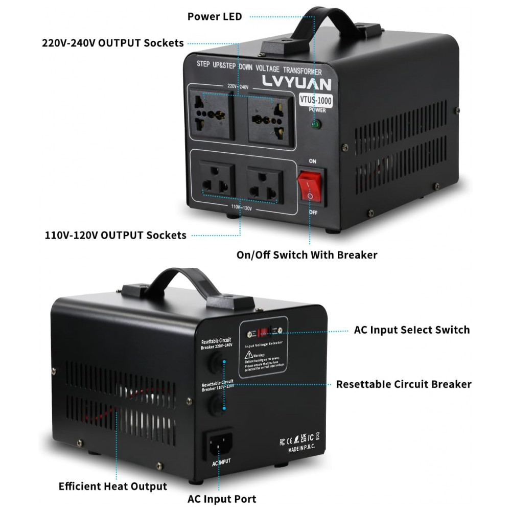 Transformador Conversor de Voltagem LVYUAN 1000W Preto Step Up/Down 110-120V/220-240V com 2 Tomadas US e 2 Universais VTUS-1000 110V