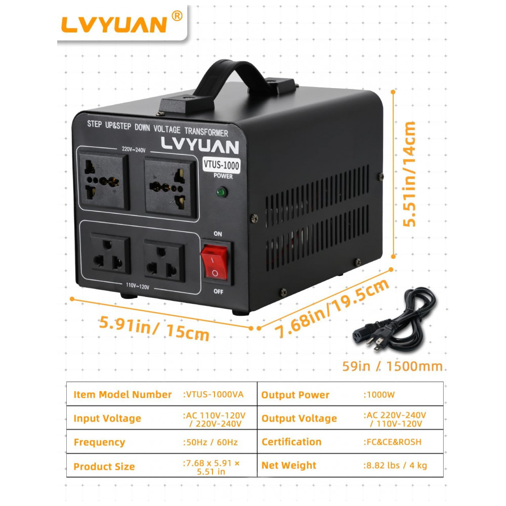 O transformador conversor de voltagem LVYUAN 1000W VTUS-1000 executa conversão step up de 110-120V para 220-240V e step down de 220-240V para 110-120V, suportando carga máxima de 1000W. Oferece saídas simultâneas com 2 tomadas US para 110-120V e 2 tomadas universais para 220-240V, com cabo de alimentação destacável para adaptação internacional. Construção em carcaça metálica preta com resfriamento passivo sem ventilador garante operação silenciosa e sem odor, utilizando componentes ambientalmente corretos.