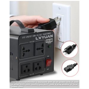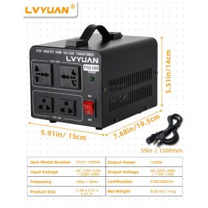 O transformador conversor de voltagem LVYUAN 1500W VTUS-1500 executa conversão step up de 110-120V para 220-240V e step down de 220-240V para 110-120V, com capacidade máxima de 1500W. Disponibiliza saídas simultâneas com 2 tomadas US para 110-120V e 2 tomadas universais para 220-240V, incluindo cabo de alimentação destacável para compatibilidade com padrões internacionais variados. Construção com carcaça metálica preta, resfriamento passivo sem ventilador, operação silenciosa e sem odor, empregando componentes ambientalmente corretos.