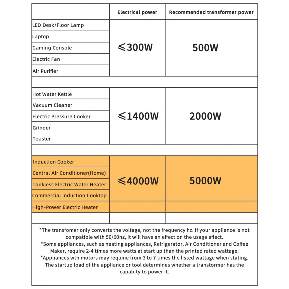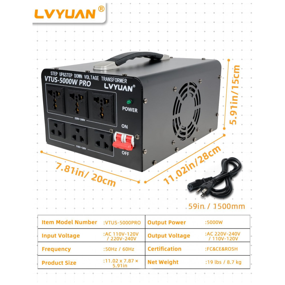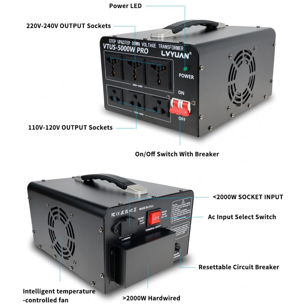 O transformador conversor de voltagem LVYUAN 5000W VTUS-5000-PRO realiza conversão step up de 110-120V para 220-240V e step down de 220-240V para 110-120V, com capacidade máxima de 5000W. Suporta conexão hard-wired para alimentação direta de equipamentos de alta potência, desativando as tomadas durante esse modo para maior eficiência e segurança elétrica. Inclui controle inteligente de temperatura com ventilador ativado automaticamente acima de 50°C, operação simultânea em saídas 110-120V (tomadas US) e 220-240V (universais), além de cabo de alimentação destacável para compatibilidade internacional.