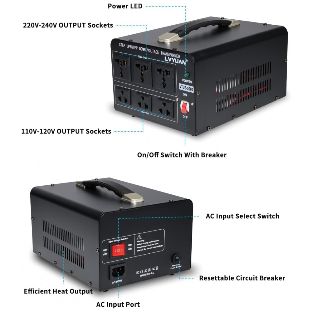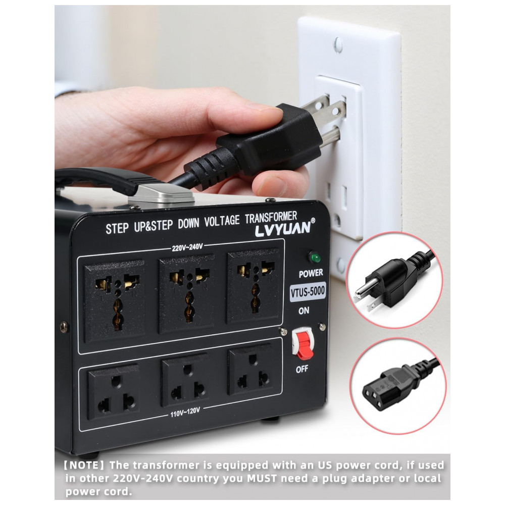 Transformador Conversor de Voltagem LVYUAN 5000W Preto Step Up/Down 110-120V/220-240V com 3 Tomadas US e 3 Universais LVYUAN-5000W-Transformer 120V