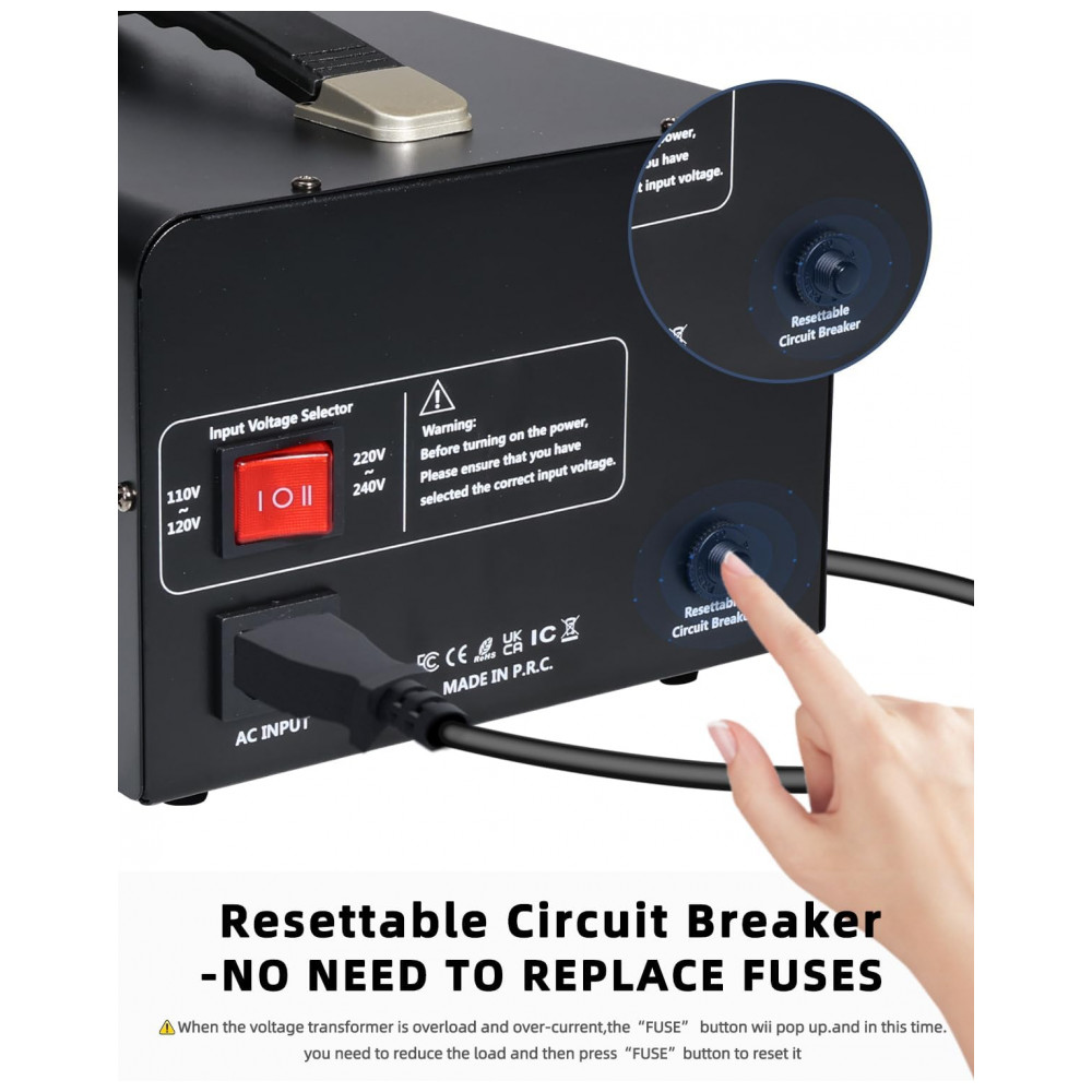 O transformador conversor de voltagem LVYUAN 5000W é um equipamento robusto projetado para conversão step up/down de tensão elétrica, elevando de 110-120V para 220-240V ou reduzindo de 220-240V para 110-120V. Possui capacidade máxima de carga de 5000W com operação simultânea em dois modos de saída: 3 tomadas US para 110-120V e 3 tomadas universais para 220-240V. Inclui cabo de alimentação destacável compatível com padrões internacionais e proteção por disjuntor resettável, que restaura a função ao pressionar o botão em caso de sobrecarga, sem necessidade de troca de fusível.