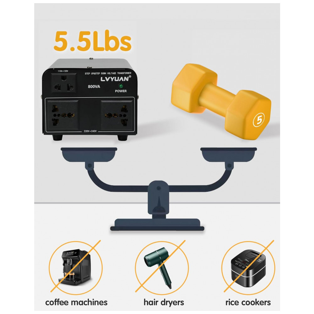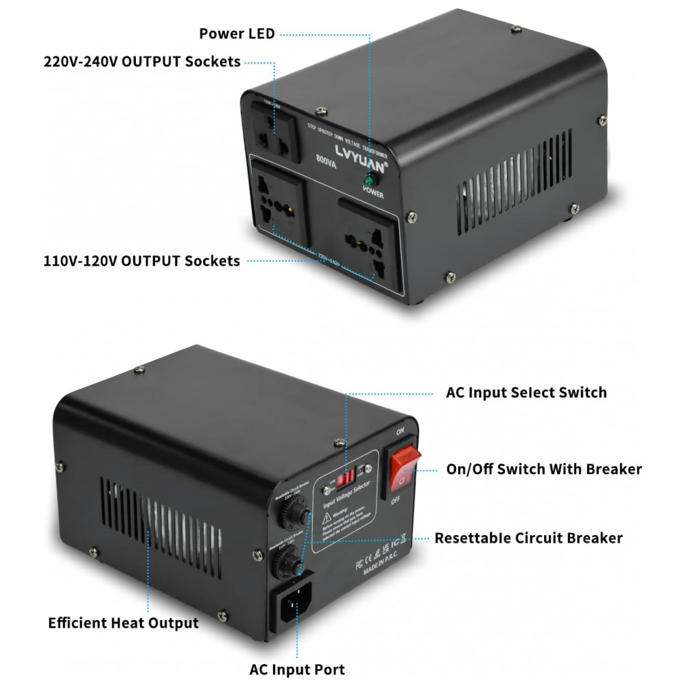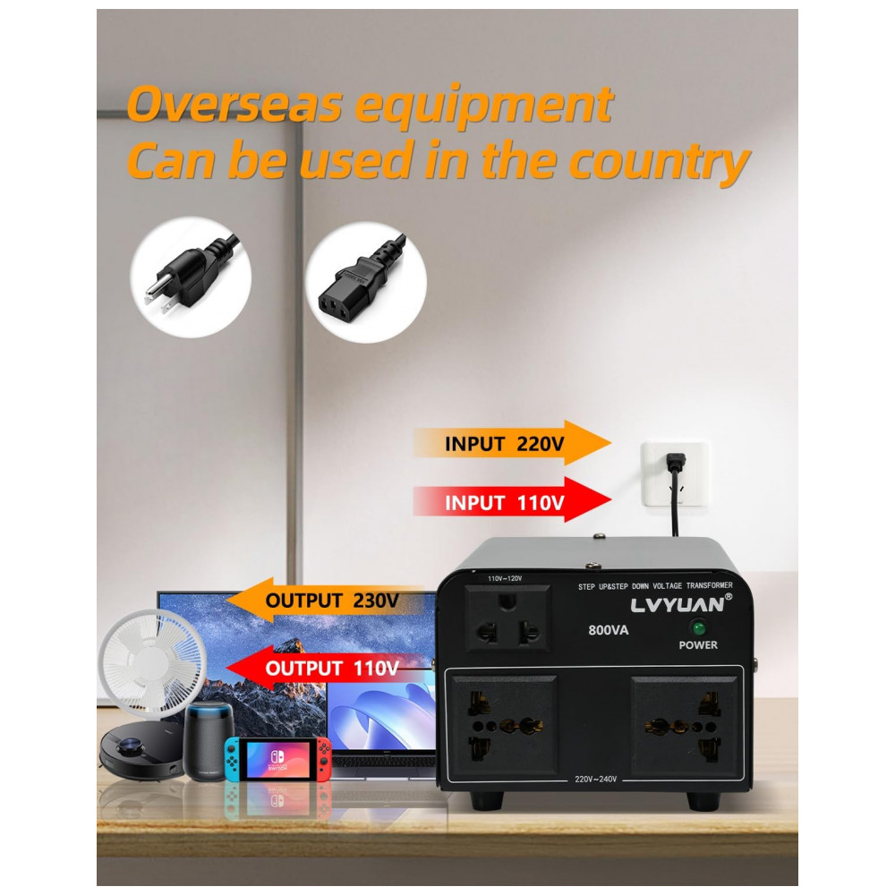 O transformador conversor de voltagem LVYUAN 800W VTUS-800 executa conversão step up de 110-120V para 220-240V e step down de 220-240V para 110-120V, com capacidade máxima de 800W e 100% de loading capacity. Disponibiliza saídas simultâneas com 2 tomadas US para 110-120V e 2 tomadas universais para 220-240V, incluindo cabo de alimentação destacável para compatibilidade internacional. Construção com carcaça metálica preta e resfriamento passivo sem ventilador assegura operação silenciosa e sem odor, com componentes ambientalmente corretos.