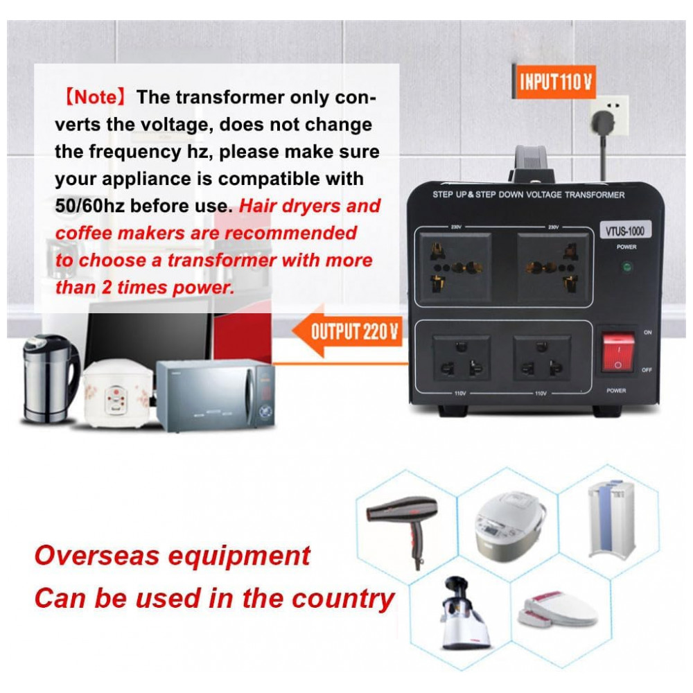 Transformador de tensão 220 V a 110 V, 110 V a 220 V Oferecemos a você uma solução fácil, segura, confiável, estável e econômica para converter tensões. Aumente 110 V 120 V a 220 V 240 V ou reduza 220 V 240 V a 110 V 120 V O interruptor está na parte traseira da unidade Multifunção O Transformador Conversor de Tensão pode ser com qualquer tipo de aparelho ou dispositivo de até 600 watts, como CPAP, Escova de dentes elétrica, Alisador de cabelo, Laptop, Celulares, Curling Irons, Aquecimento, Televisão, Xbox, etc. 7x24hrs Contínuo Executar transformador toroidal de alta eficiência com saída estável e baixo consumo. Ele passou no teste de aumento de temperatura e no relatório de teste IEC. Tomadas múltiplas 4 saídas CA, 2 tomadas padrão dos EUA para aparelhos de 110 120 V 2 tomadas universais aceitam todos os tipos de plugues, exceto o plugue sul africano grande para aparelhos de 220 240 V. O transformador pode ser em países cuja voltagem é 90 V 125 V ou 180 V 250 V como EUA, EUR, Reino Unido, JP e muito mais. Disjuntores duplos protetores para cada voltagem que é uma operação segura.