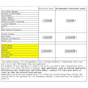 Por exemplo, se o seu aparelho estiver avaliado em 100 watts, você precisará comprar um transformador com uma potência máxima de pelo menos 150 watts ou mais. Alguns aparelhos, como aparelhos de aquecimento, ferramentas elétricas, cafeteira, impressoras a laser, secador de cabelo com dison, exigem 2 4 vezes mais watts na inicialização do que a potência nominal impressa.