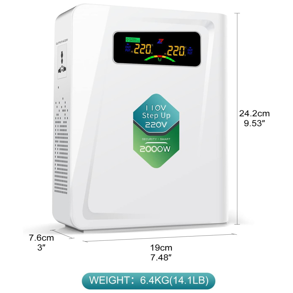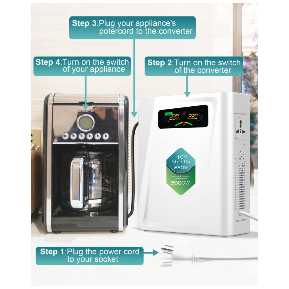 Aviso 2000W Step Up Transformer 110v a 220v Isso é adequado para usar aparelhos europeus ou asiáticos nos EUA, se você precisar usar aparelhos de 110V na Europa, você pode escolher o transformador de tensão redutor Como todos sabemos, na maioria dos casos, a energia consumida pelo aparelho no momento de ligar é o maior, então ao escolher um transformador, consulte 1,25 vezes a potência do aparelho que você precisa usar para escolher o transformador certo. Por exemplo, se o seu aparelho for de 800 watts, escolha um transformador com pelo menos 800 1,25 1000W. Por motivos de segurança, recomenda se o uso de aparelhos que não excedam 1600W para evitar danos ao transformador e aos aparelhos s Conversor de tensão atualizado de 110 para 220 Ao contrário daqueles conversores grandes e volumosos e fedorentos, este recém projetado conversor de 110 V para 220 V não produz ruído, cheiro, calor, é mais silencioso, mais eficiente, mais fino e possui ventosas na parte inferior para torná lo mais . Você pode colocá lo em sua sala de estar ou na bancada da cozinha Dez funções de proteção 1. Proteção contra sobrecarga 2. Proteção contra sobretensão 3. Proteção contra baixa tensão 4. Função de partida suave, sem mais fenômenos de tropeço 5. Proteção atrasada 6. Desligamento de curto circuito proteção 7.Proteção contra superaquecimento 8.Proteção da placa de circuito contra infiltração de água 9.Resistência à temperatura do material de isolamento de mais de 320 F 10.Ventosa na parte inferior, evita que o transformador caia 50 60 Hz 110 a 220 Conversor Verifique a potência e voltagem de seus aparelhos antes de comprar nossos produtos e não os abuse.