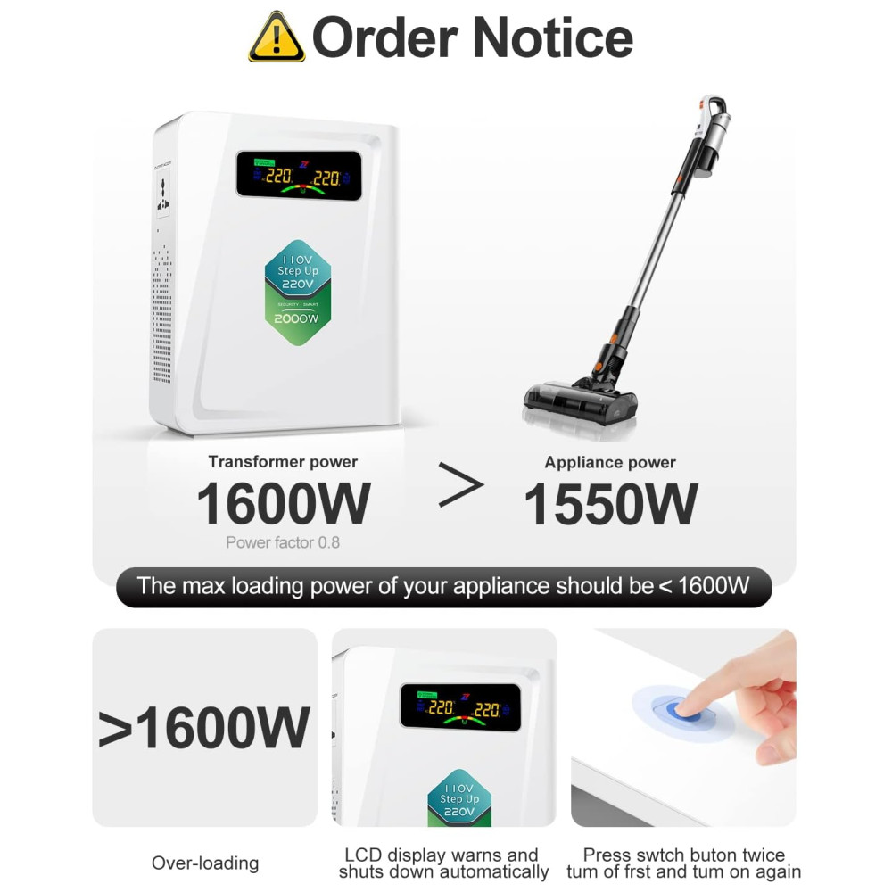 Para evitar retornos desnecessários, confirme a potência do aparelho antes de comprar o transformador. Por razões de segurança, recomenda se que os aparelhos não sejam over 1600W devem ser s para evitar danos ao transformador e aos aparelhos utilizados .