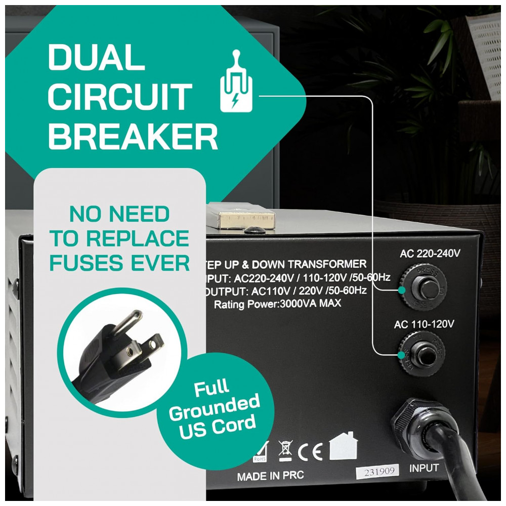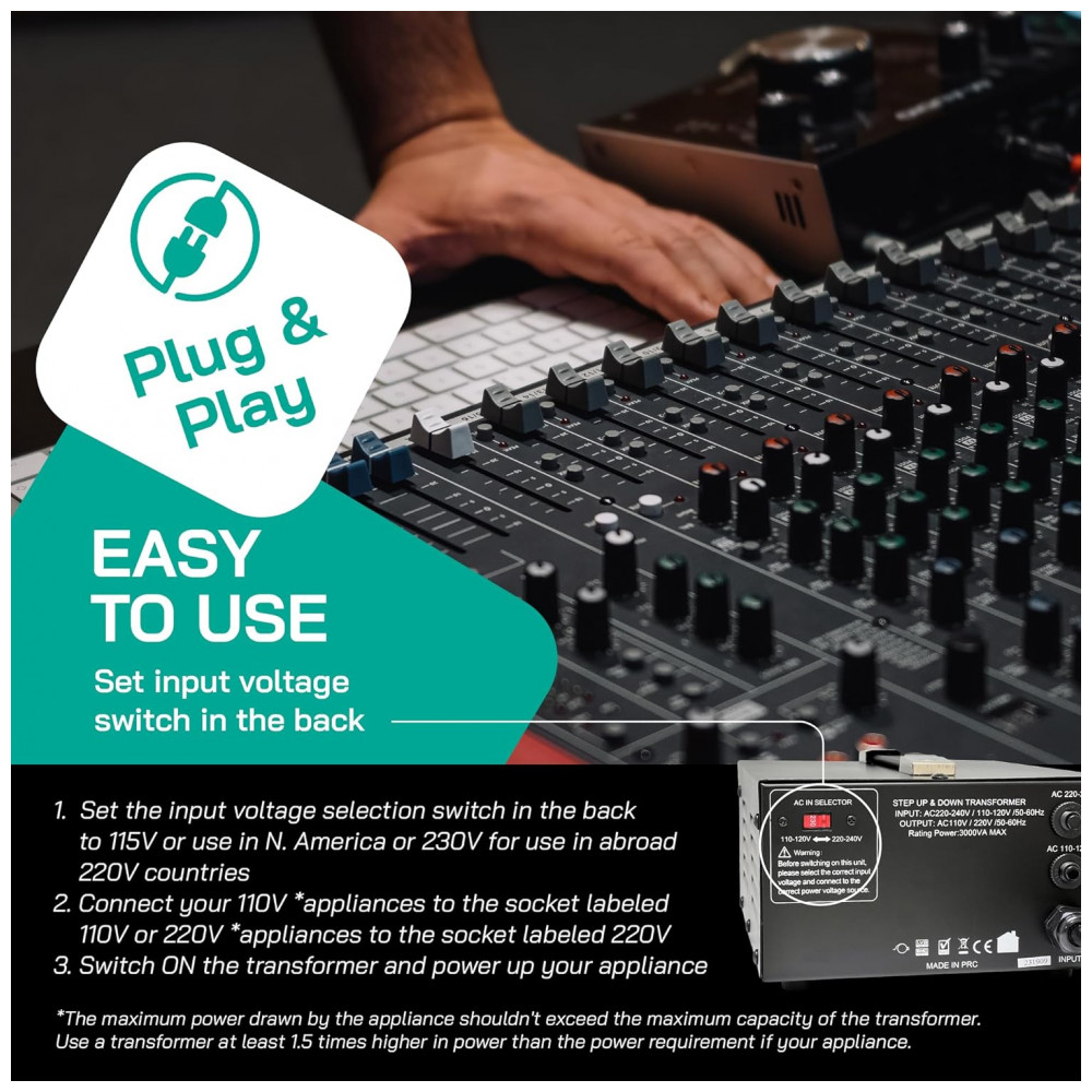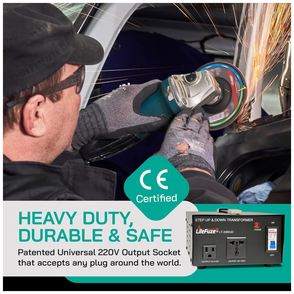Transformador conversor de tensão com certificação CE. Este é o conversor de tensão de alimentação premium de 220 a 110, que é durável porque é feito de metal de alta qualidade. Por questões de segurança, é recomendado o uso de um Transformador Conversor de Tensão com potência máxima pelo menos 1,5x maior que o seu eletrodoméstico. Por exemplo, este transformador de 3000 Watts só pode ser com um aparelho que usa até 1800 Watts, para evitar danos do próprio transformador e do aparelho que está sendo . Recomendamos fator de eficiência 3X para itens de produção de calor de alta potência, como cafeteira, máquina Expresso, torradeira, equipamentos de soldagem, etc. Fácil de converter AC 110V para 220V ou AC 220V para 110V. Este conversor foi projetado apenas para a fase monofásica de 220 V da Ásia européia, não funcionará com a fase dupla americana 220, não foi projetado para os EUA 220 V. Este transformador não faz barulho durante o uso. Os Transformadores Conversores de Voltagem de Viagem LiteFuze Heavy Duty Step Up Step Down são destinados ao uso mundial para todos os eletrônicos, máquinas pesadas ou aplicações industriais domésticas. Ideal para cafeteira. Este pacote inclui 1 x 3000 W Voltage Power Converter Transformer Universal Output Socket Equipado com uma tomada universal que aceita plugues de quase todos os países do mundo e completamente aterrada da entrada à saída para operação segura. A tecnologia ConvertingboxTM usa transformador toroidal para eficiência, operação sem ruído e conversor de tensão mais compacto, com cerca de metade do tamanho e menos peso quando comparado aos transformadores tradicionais. A proteção de fusível protege seus componentes eletrônicos e o transformador contra sobrecarga de energia ou tensão. O fusível cortará a energia do transformador durante a sobrecarga e você pode facilmente substituir o fusível para reiniciar o transformador. Operação Step Up Down para serviço pesado Converter 110 117 120 V CA para 220 230 240 V CA OU 220 230 240 V CA para 110 117 120 V CA. Defina o interruptor de tensão de entrada na parte traseira com base na tensão do país e conecte seu aparelho à tomada apropriada na frente. Observe que esses transformadores apenas convertem a tensão e a frequência Hz de saída permanece a mesma da entrada. Litetime Copper Coil cada transformador é enrolado com bobina e fio premium para garantir um desempenho confiável e eficiente por um longo período de tempo. Esses transformadores não foram projetados para operar em 220 V dos EUA e não são compatíveis com aparelhos de 220 V dos EUA. Você pode usá los para alimentar eletrônicos dos EUA no exterior em um país de 220 V ou usar eletrônicos de 220 V na América do Norte em 120 V. Selecione um transformador de tensão de tamanho adequado, verificando a potência máxima em W ou WATT em seus componentes eletrônicos e, em seguida, compre um transformador de pelo menos 1,25x esse tamanho para contabilizar quaisquer surtos ou picos durante a operação