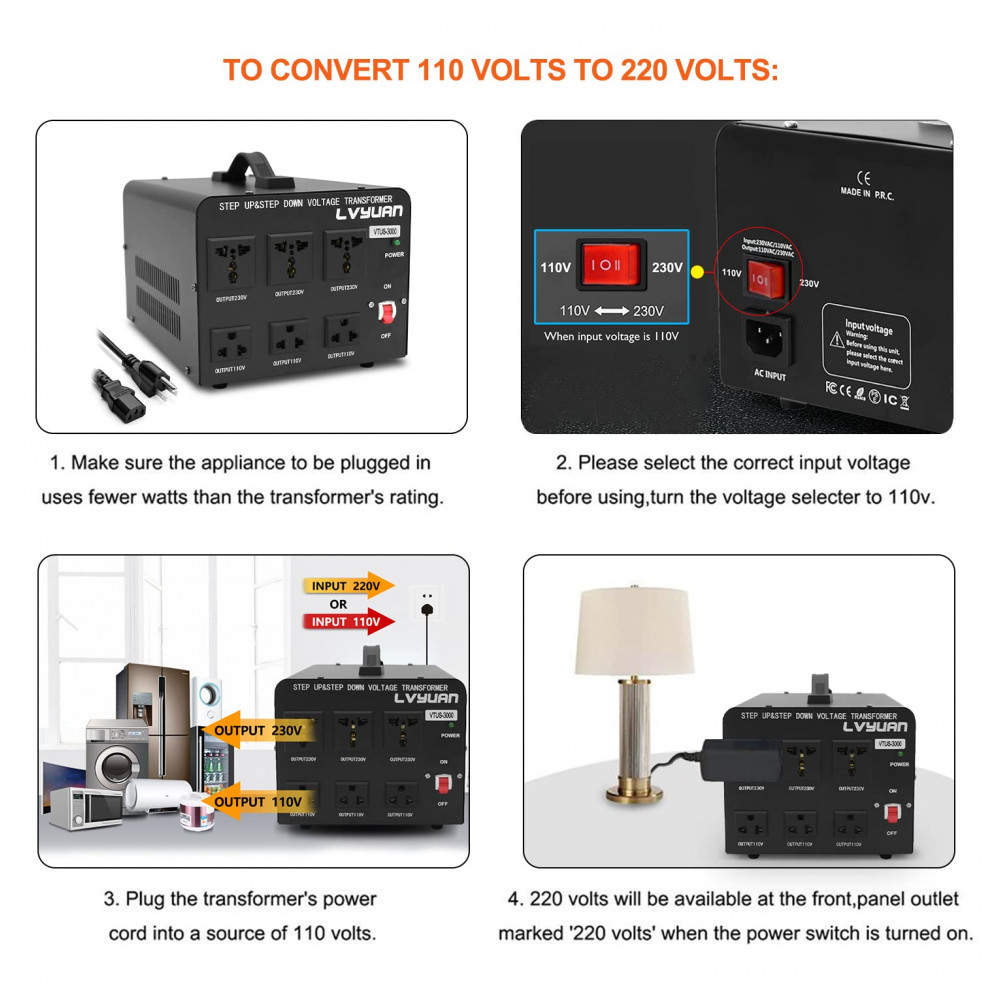 Por exemplo, se o seu aparelho for classificado em 100 watts, você precisará comprar um transformador com potência máxima de pelo menos 150 watts ou mais. Alguns aparelhos, como aparelhos de aquecimento, ferramentas elétricas, AC, impressoras a laser e cafeteira, requerem 2 a 4 vezes mais watts na inicialização do que a potência nominal impressa.