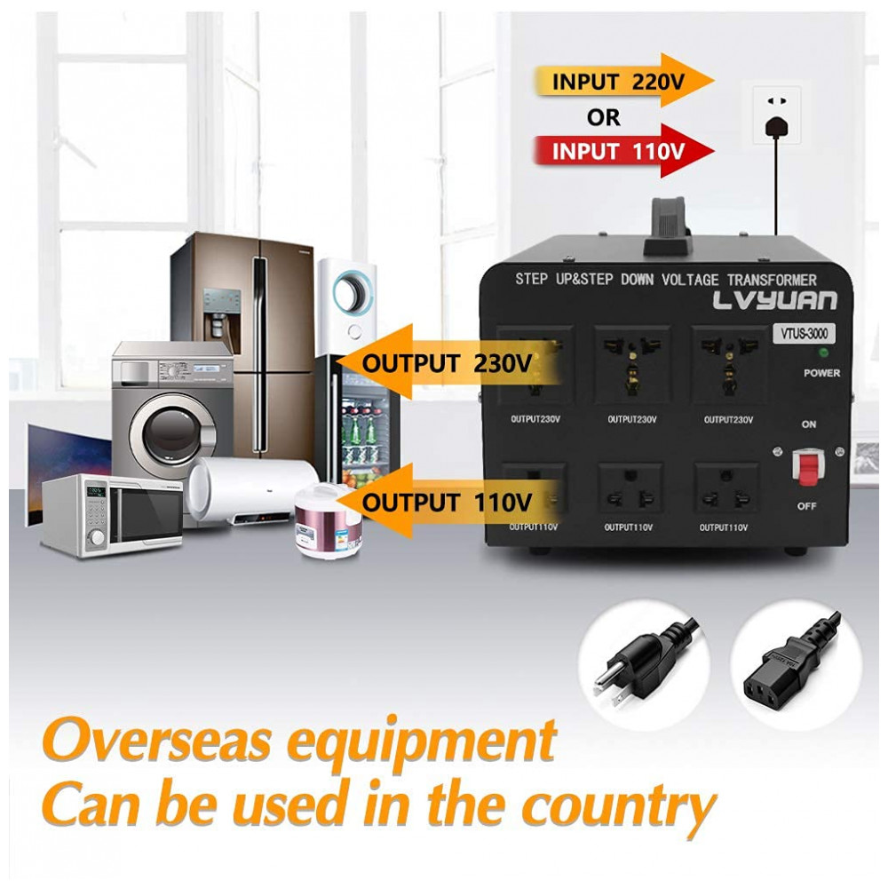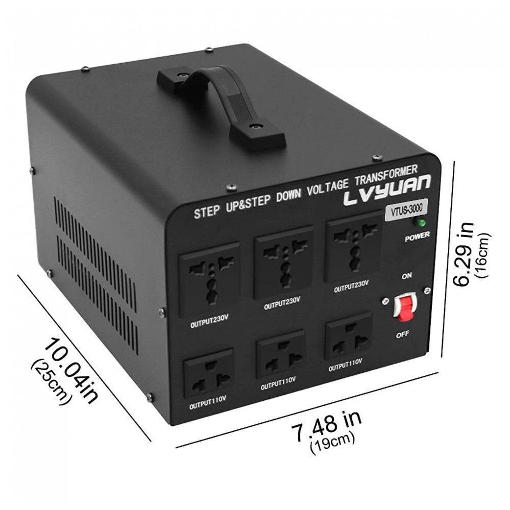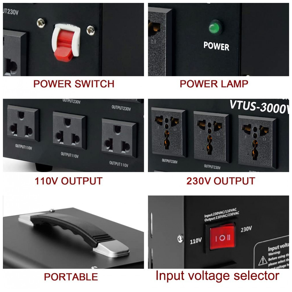 Transformador de tensão de 3000 W Nós fornecemos a você uma solução segura, confiável, estável e econômica para converter tensões de 110 volts para 220 volts ou de 220 volts para 110 volts. Ampla aplicação O conversor de transformador de tensão pode ser com qualquer tipo de aparelho ou dispositivo, como panelas de arroz, panelas de água quente, misturadores de alimentos domésticos, liquidificadores com o consumo máximo de energia MPC entre 1050 e 2250 watts. Funcionamento Contínuo 7x24hrs Transformador toroidal de alta eficiência com saída estável e baixo consumo. Saídas CA 3 tomadas padrão dos EUA para aparelhos de 110 120V 3 tomadas universais aceitam todos os tipos de plugues, exceto o plugue sul africano grande para aparelhos de 220 240V. EUR, Reino Unido, JP e muito mais. Proteção Disjuntor protetor para cada tensão que é operação segura. Se você tiver alguma dúvida, não hesite em contactar nos.