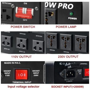 Multifunção O Transformador Conversor de Tensão pode ser utilizado com qualquer tipo de aparelho ou dispositivo de até 3400 watts. Recomendamos fator de eficiência 3X para itens de produção de calor de alta potência, como ar condicionado, cafeteira, equipamentos de soldagem, etc. Transformador de tensão 220V a 110V, 110V a 220V 110 volts até 220 volts ou de 220 volts até 110 volts. Saídas CA 3 tomadas padrão dos EUA para aparelhos de 110 120V 3 tomadas universais aceitam todos os tipos de plugues, exceto o plugue sul africano grande para aparelhos de 220 240V. EUR, Reino Unido, JP e muito mais. Proteção Disjuntor protetor para cada voltagem que é operação segura.