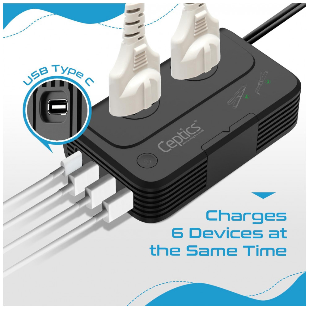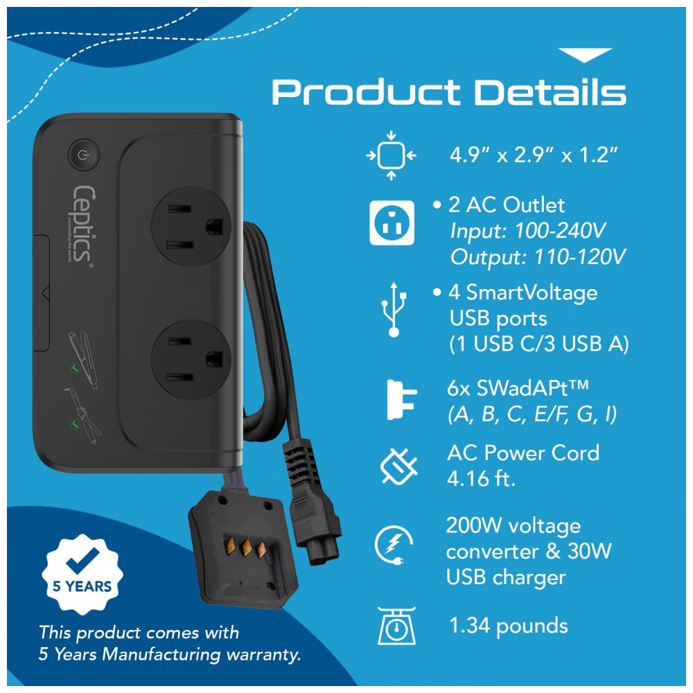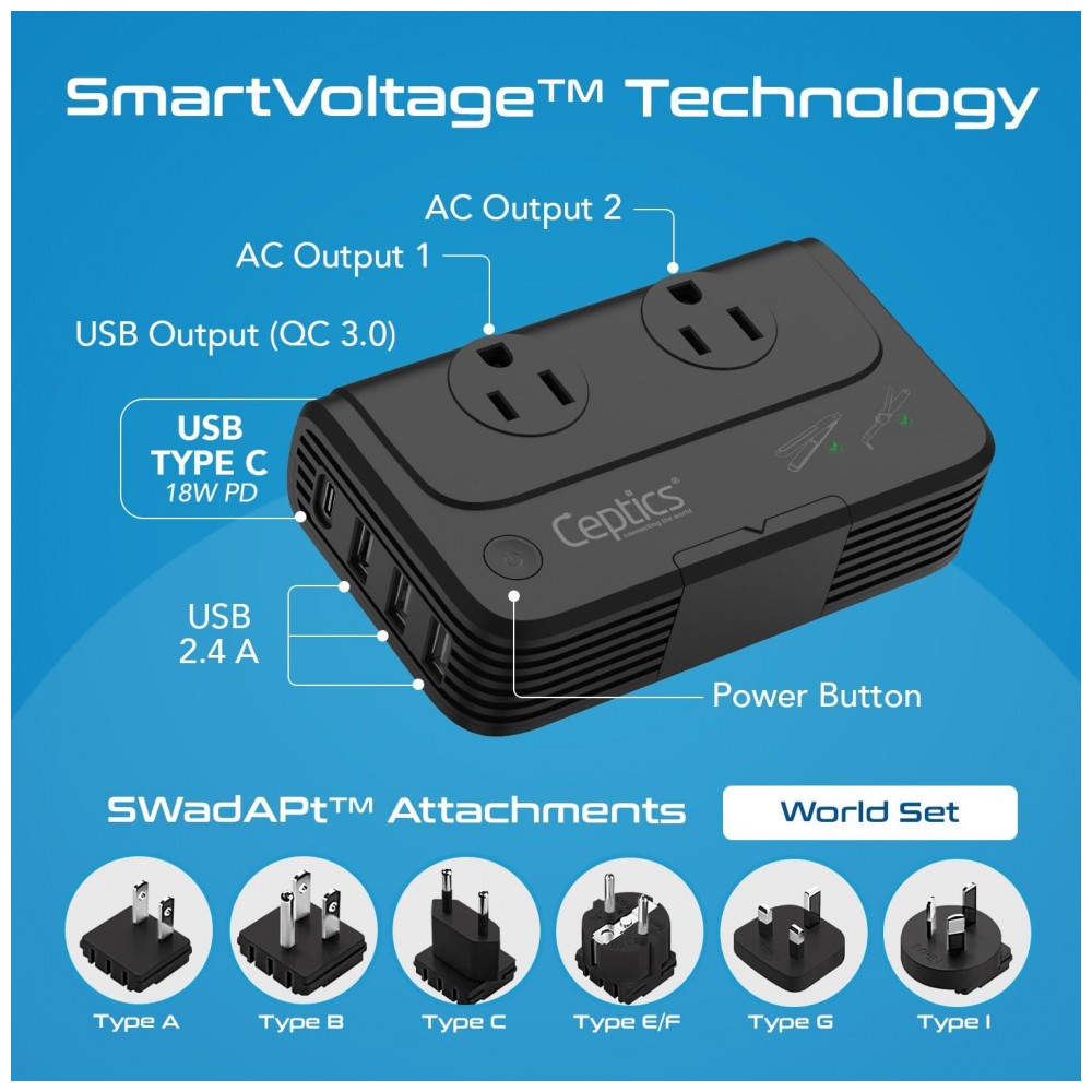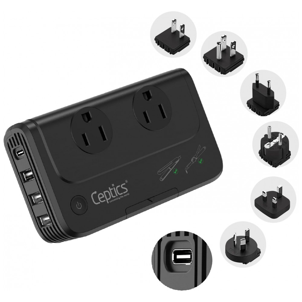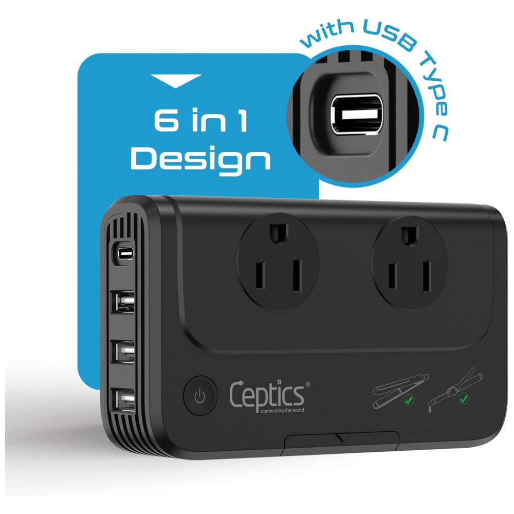 Carregue até 6 dispositivos simultaneamente Com 2 entradas dos EUA e 4 portas USB com carregamento rápido QC 3.0, nosso conversor é perfeito para dispositivos como CPAP, escova de dentes elétrica, ventilador, nebulizador, console de jogos e muito mais. A tecnologia Ceptics pode fornecer até 6.4A de corrente de saída máxima, se ajustando automaticamente à carga máxima de cada dispositivo conectado.
