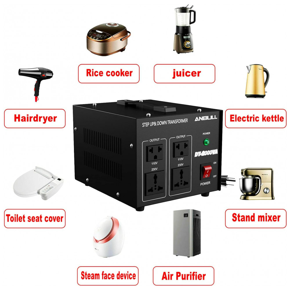 O transformador de voltagem Anbull 2000W é um conversor do tipo step up e step down projetado para operar equipamentos entre redes de 110V/120V e 220V/230V/240V, conforme a tensão disponível e a exigida pelo aparelho. A construção robusta com carcaça metálica e bobina estável oferece operação contínua dentro da faixa de potência especificada, com foco em uso residencial ou em pequenas estruturas com equipamentos compatíveis.
